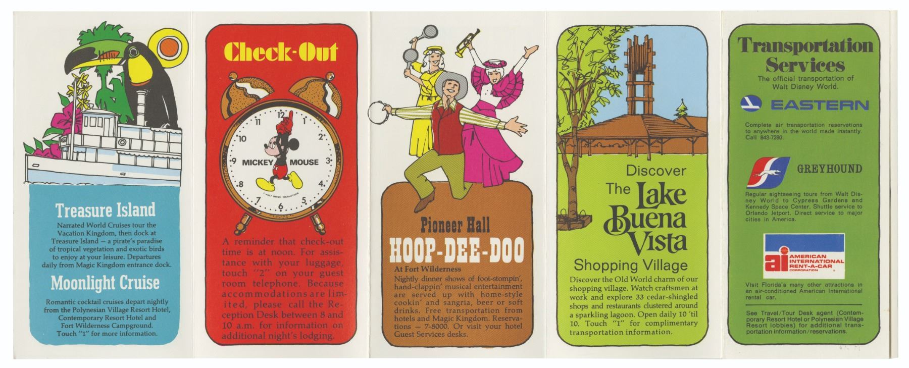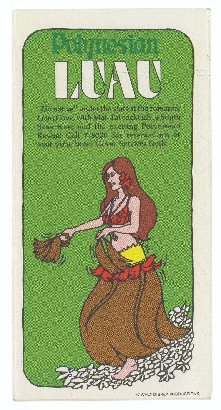 (Polynesian Village, c.1976) An original accordion-style table card used within hotel rooms at the Polynesian Village Resort to promote the Hotel's services and offerings. Featuring stylish graphics and information on Polynesian Luaus, Moonlight Cruises, Pioneer Hall, and much more, this very rare table card is a wonderful item from the early years of this popular hotel. Measuring 5.5"x19.5" when opened, the card is in very good condition with minor wear,