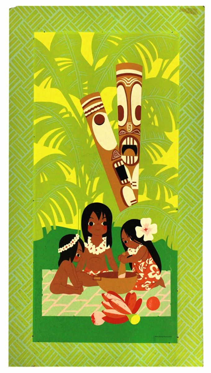(Walt Disney World, 1970s) Beautiful silkscreened artwork that decorated the rooms at the Polynesian Village Resort. The artwork is taken from concept artwork by Imagineer Mary Blair. Measures 25"x45". In good used condition with wear from use and edge chipping.