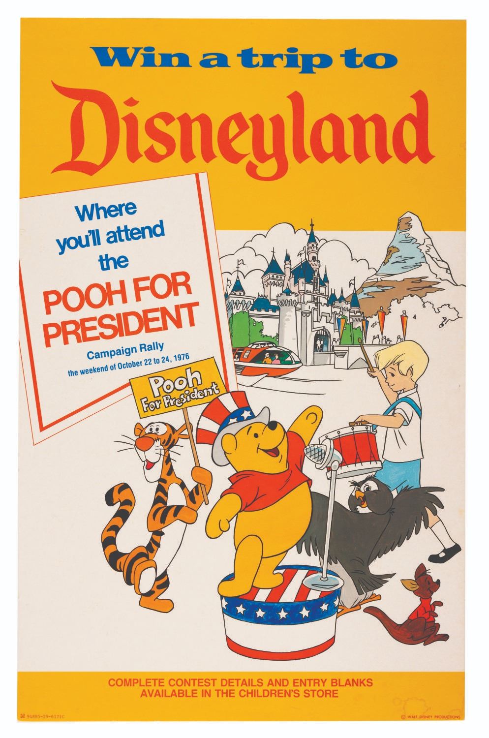 (Disneyland, 1976) Three items for Disneyland's "Pooh for President" promotional events in 1976 which celebrated the election year with a light-hearted “campaign” at the Park. Included are a small and a large poster, both featuring Pooh and his Friends in front of Sleeping Beauty Castle and a store counter display. Ranging in size from 11" x 18" to 22" x 28", the items are in good condition with light wear from use including light smudges, scuffs, stains, and a few small spots of discoloration.