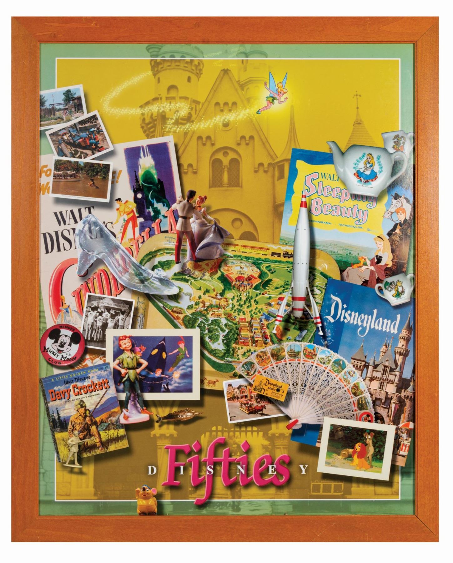 (Pop Century, 2002) Original framed wall art from a hotel room at Disney's Pop Century Resort. This artwork references the 1950s and features many iconic Disney characters and events from the era, including Cinderella, Peter Pan, Davy Crockett, and the opening of Disneyland. The collage style artwork comes in its original frame and measures 33.25"x27.25". The condition is fair to good, with some warping to the original frame from its use and removal.