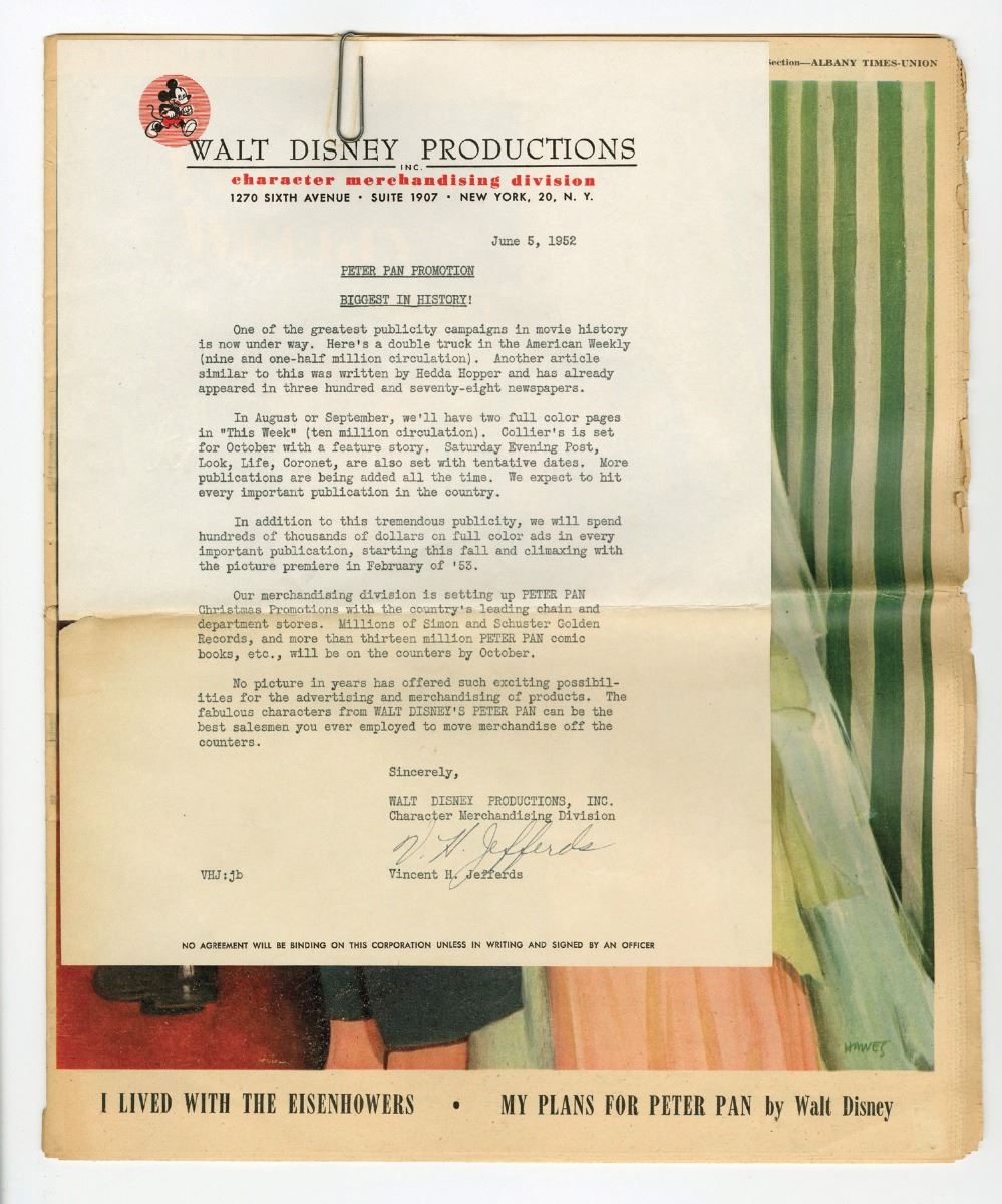 (Walt Disney Studios, 1952) June,1952 typewritten letter from Disney Merchandise division on the promotions and opportunities for "Peter Pan". The letter, sent eight months before the premiere of the film, gives an idea of the marketing plan for the film as well as merchandise planned to be released. In good condition, folded.