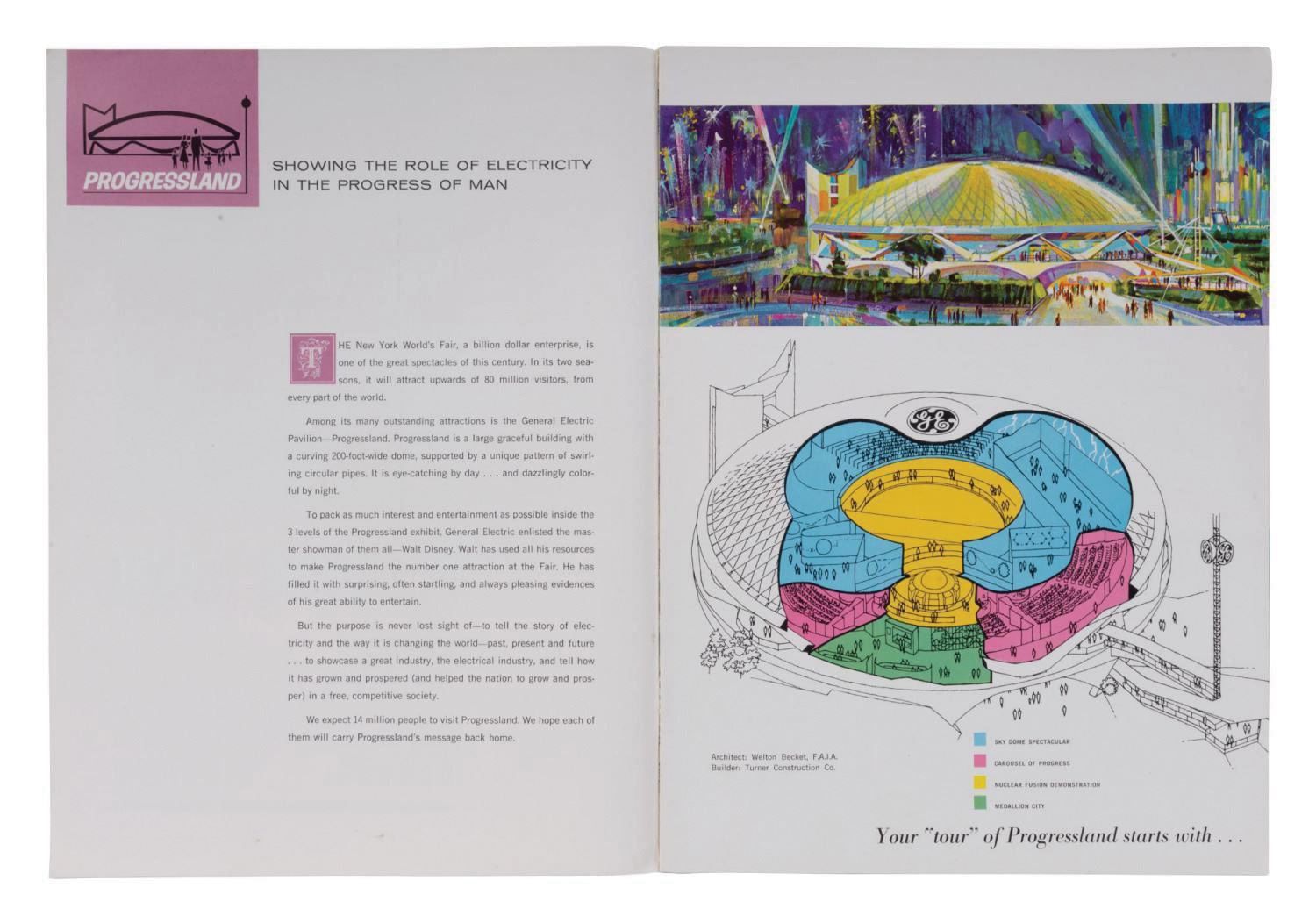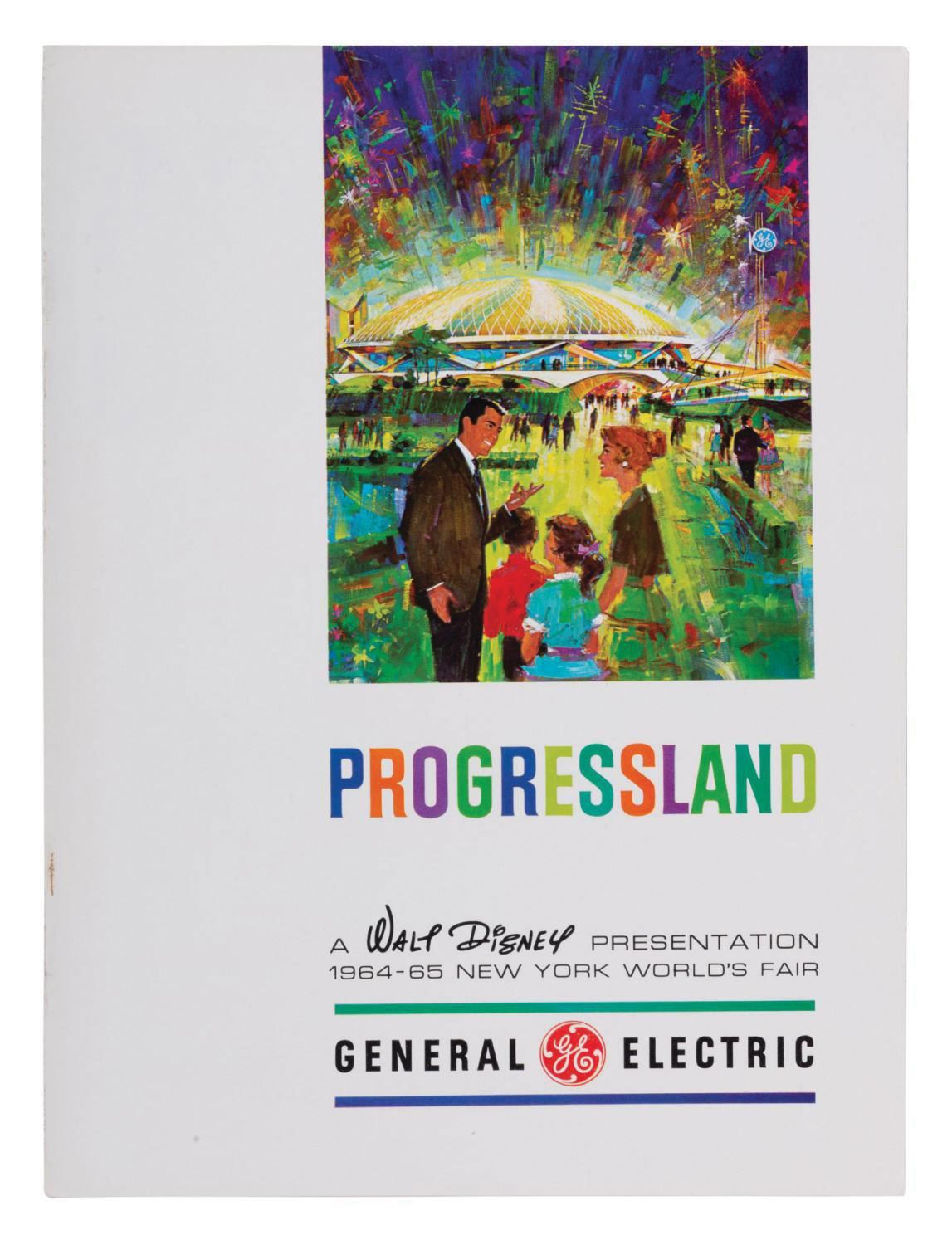 (World's Fair, 1964) A pre-opening brochure advertising the Walt Disney and General Electric presentation of Progressland for the 1964-65 New York World's Fair. The brochure contains a colorful 10-page tour of Progressland including the Carousel of Progress, the Skydome Spectacular with Fusion Demonstration, and the all-electric Medallion City of today, supported by colorful illustrations and Welton Beckett's architectural renderings. Measuring 12"x9", the brochure is in good overall condition exhibiting a few creases and handling wear.