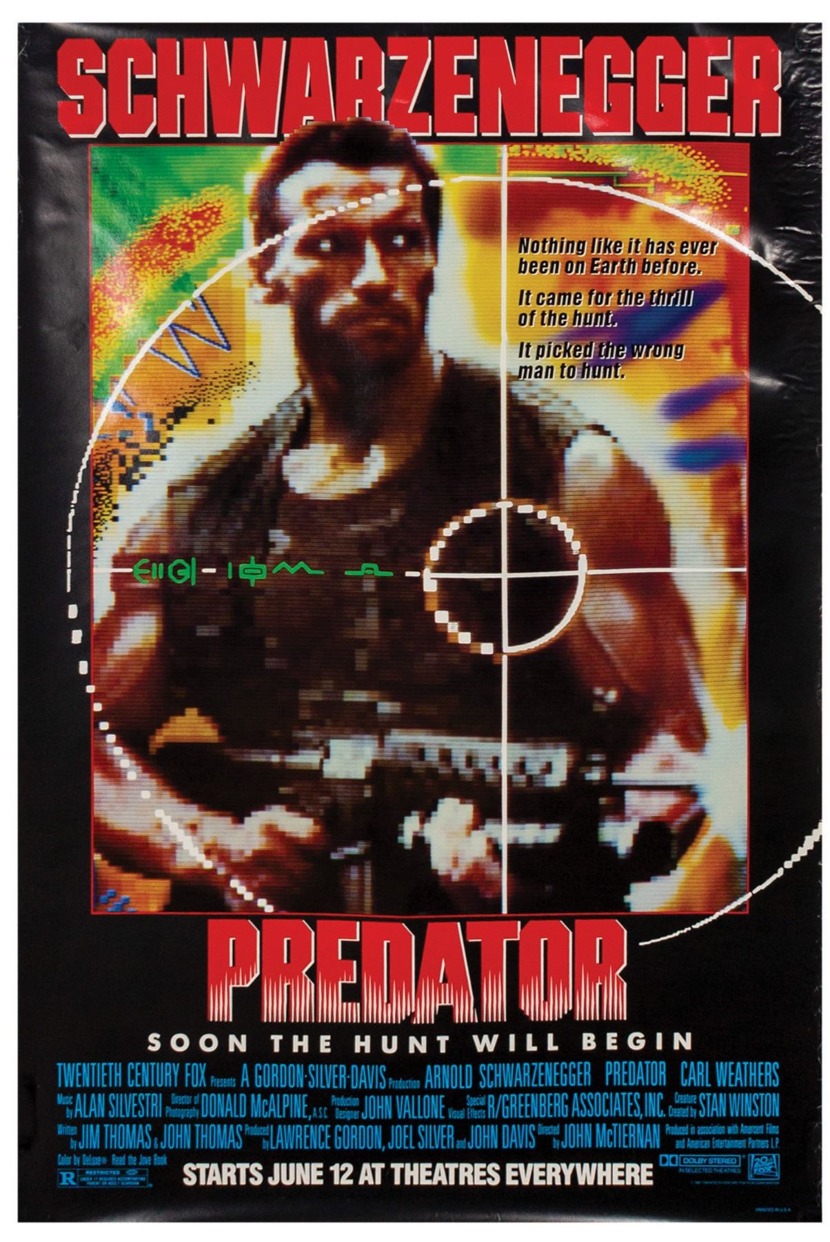 (20th Century Fox, 1987) An advance one sheet poster for Predator. Featuring a great image of Arnold Schwarzenegger within the Predator's infrared vision, this poster measures 40"x27" and is in fair to good condition. The poster has been stored rolled, and there is some edge wear, including some moisture-wear to the right-edge.