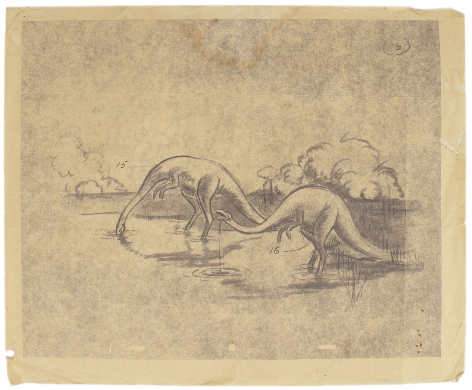 (Disneyland, c.1966) A brownline concept featuring designs for the Primeval World attraction. This artwork is attributed to the development of the attraction when it was built at Disneyland in 1966. The brownline measures 14"x17" and is in fair condition with some staining, tears at the edges, and creases from use.
