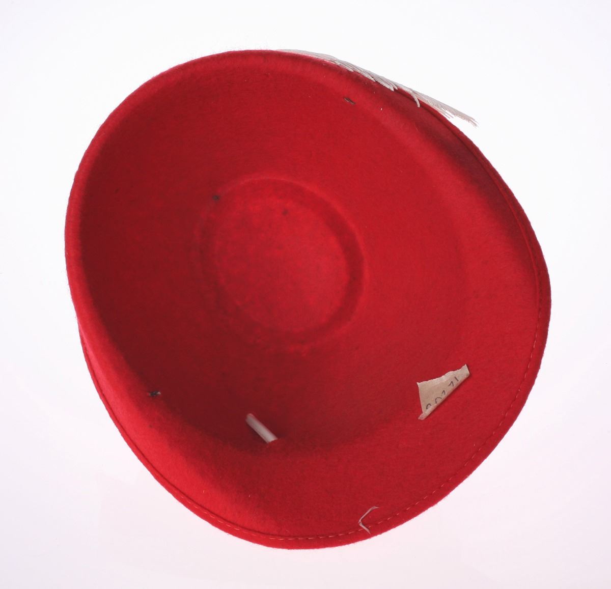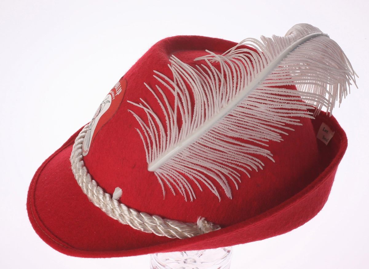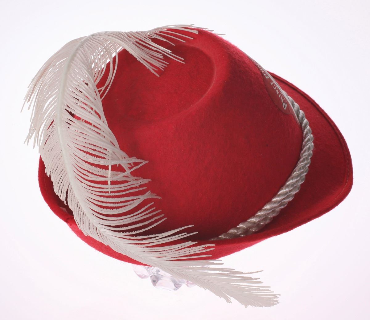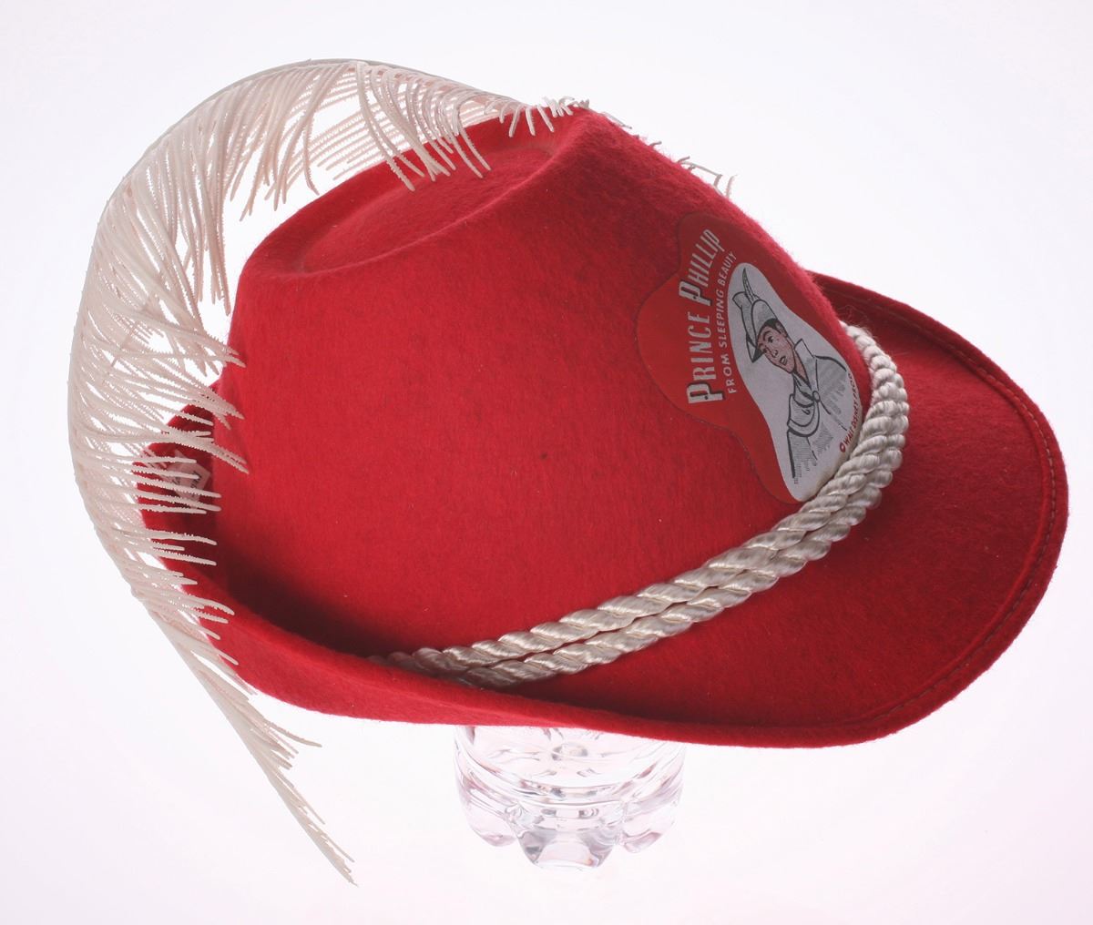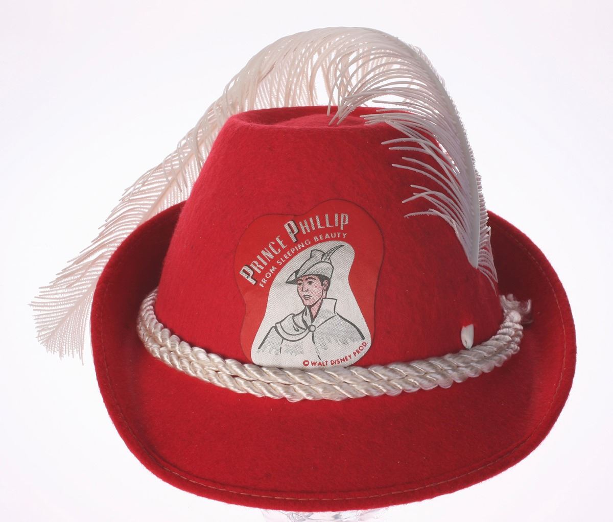 (Disneyland, 1959) Souvenir hat featuring Prince Phillip from "Sleeping Beauty". The hat is made of thick red felt with a white cord accent and plastic flower decoration. Measures 9"x8" and 5" tall. In very good condition.