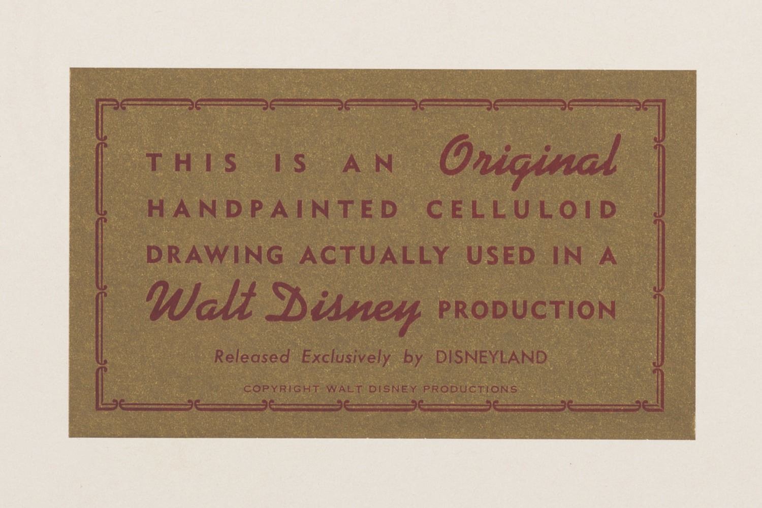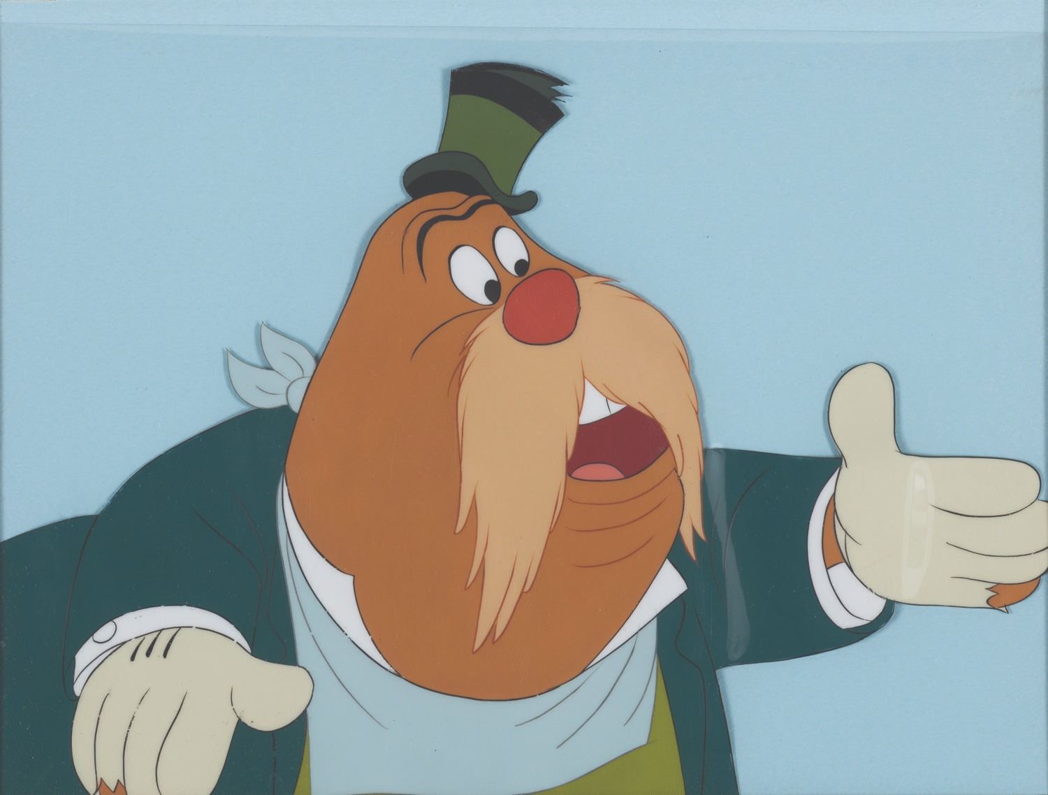 (Disney, 1951) An original production cel of the Walrus from Walt Disney's"Alice in Wonderland." This cel was originally sold at The Art Corner in Disneyland and has been slightly trimmed to 10"x7.5" and placed on a color reproduction background as prepared by the Studio for sale. The cel retains a Disneyland Gold Label on the reverse and is still sealed in its original 12"x10" mat. The character's total image size is 8.25"x6". The cel is in very good condition with some wear to ink lines
