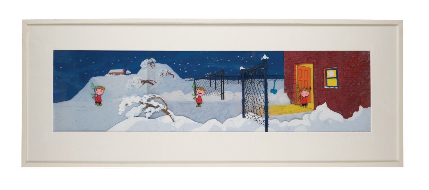 (Lee Mendleson Prod./CBS, 1965) An extremely rare and impressive panoramic production background with production cels from the classic 1965 TV Special "A Charlie Brown Christmas." The set-up features Charlie Brown as he emerges from the school auditorium detremined not to let commercialism ruin his christmas. The 9.5"x 36.75" hand-painted background appears at 22:05 thru 22:24 in the special. The cels also appear in that sequence and thru 23:02. "A Charlie Brown Christmas" was the first prime-time animated special based on the comic strip "Peanuts" by Charles Schulz. It debuted on CBS in 1965 and was run every year for the next 45 years on the network. In 2001 ABC acquired the special and it ran another 19 years on that network. The special has become a Holiday Tradition for many, and artwork from the original production is extremely rare. The piece has a viewable image size of 9.5"x36.75" within its 17"x44" frame with mat. The entire piece displays in fine condition.