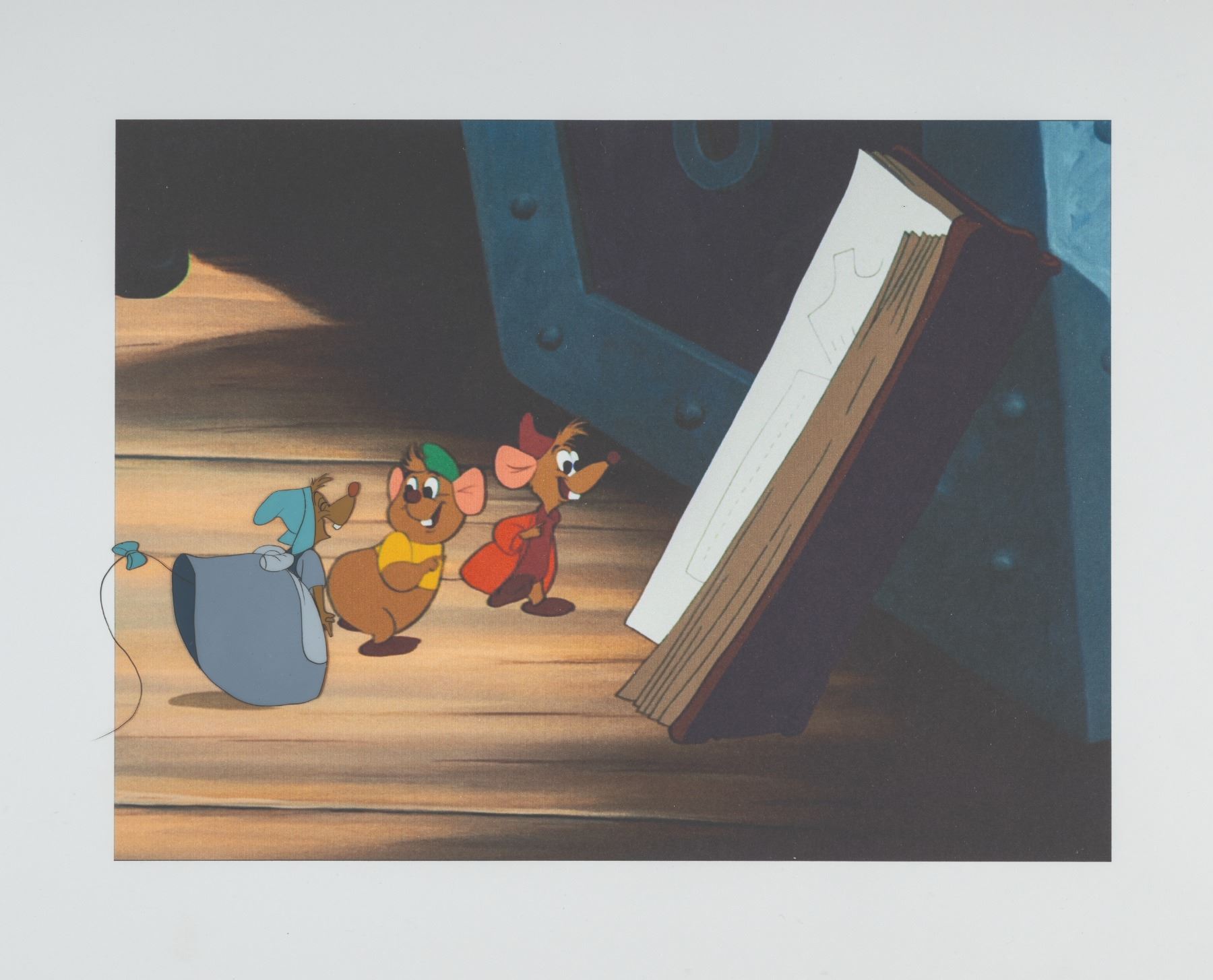 (Disney, 1950) A pair of original production cels featuring sewing mice from Walt Disney's 1950 feature film,"Cinderella." The total image size of the characters is 11"x3" on one untrimmed 15.5"x12.5" cel and one slightly trimmed 12"x10" cel. The cels are in fine condition and have been placed on a color copy background for presentation.
