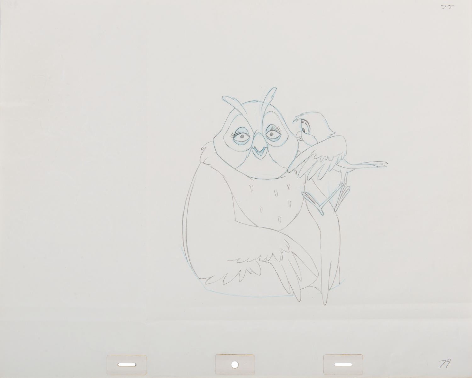 (Disney, 1981) An original production drawing of Big Mama and Dinky from Disney's feature film"The Fox and the Hound." The untrimmed animation paper measures 12.5"x15.5" and the characters have an image size of 7"x6.75". The drawing is in very good condition with faint creases, dimples, vertical and horizontal folds, and expected wear from production.
