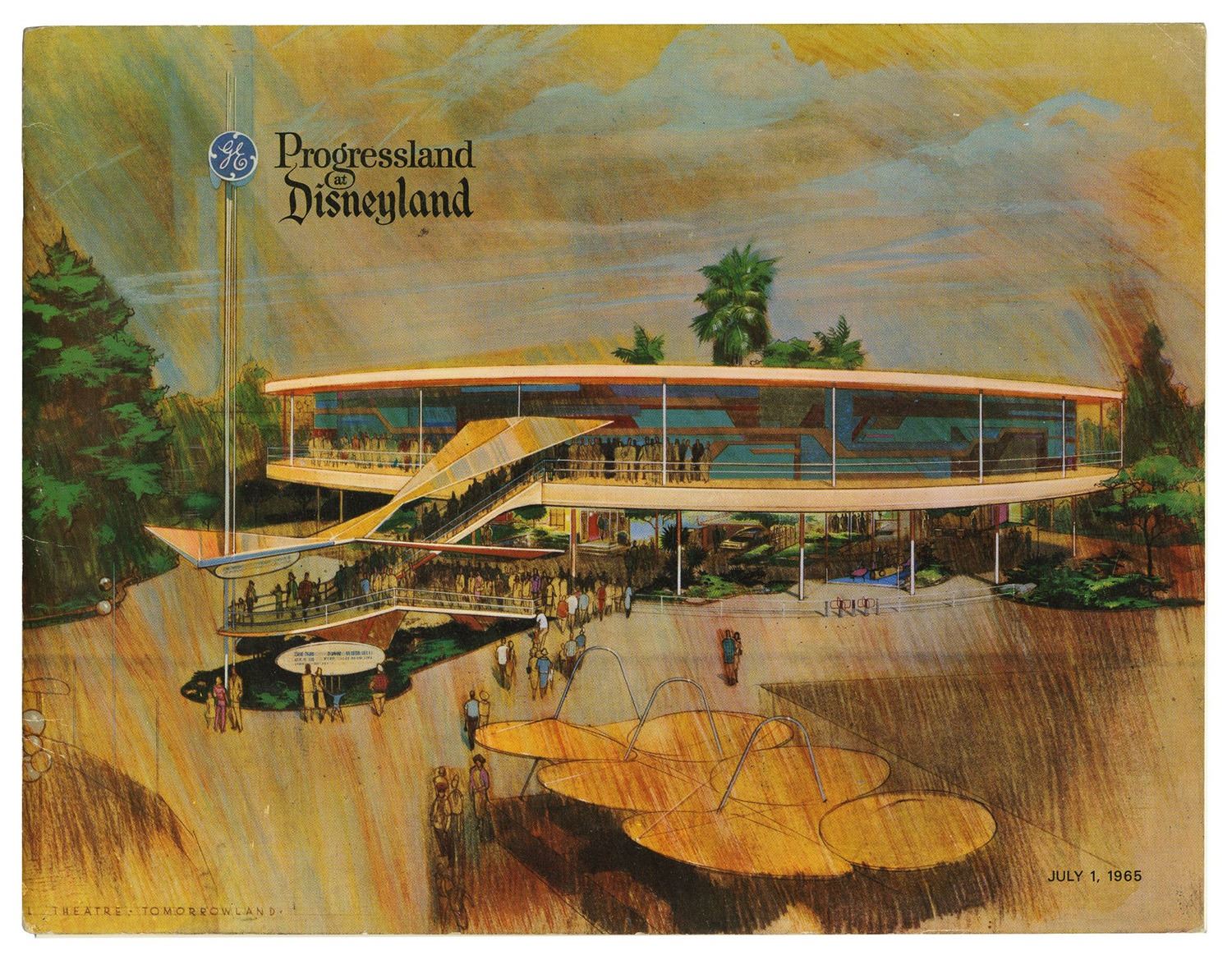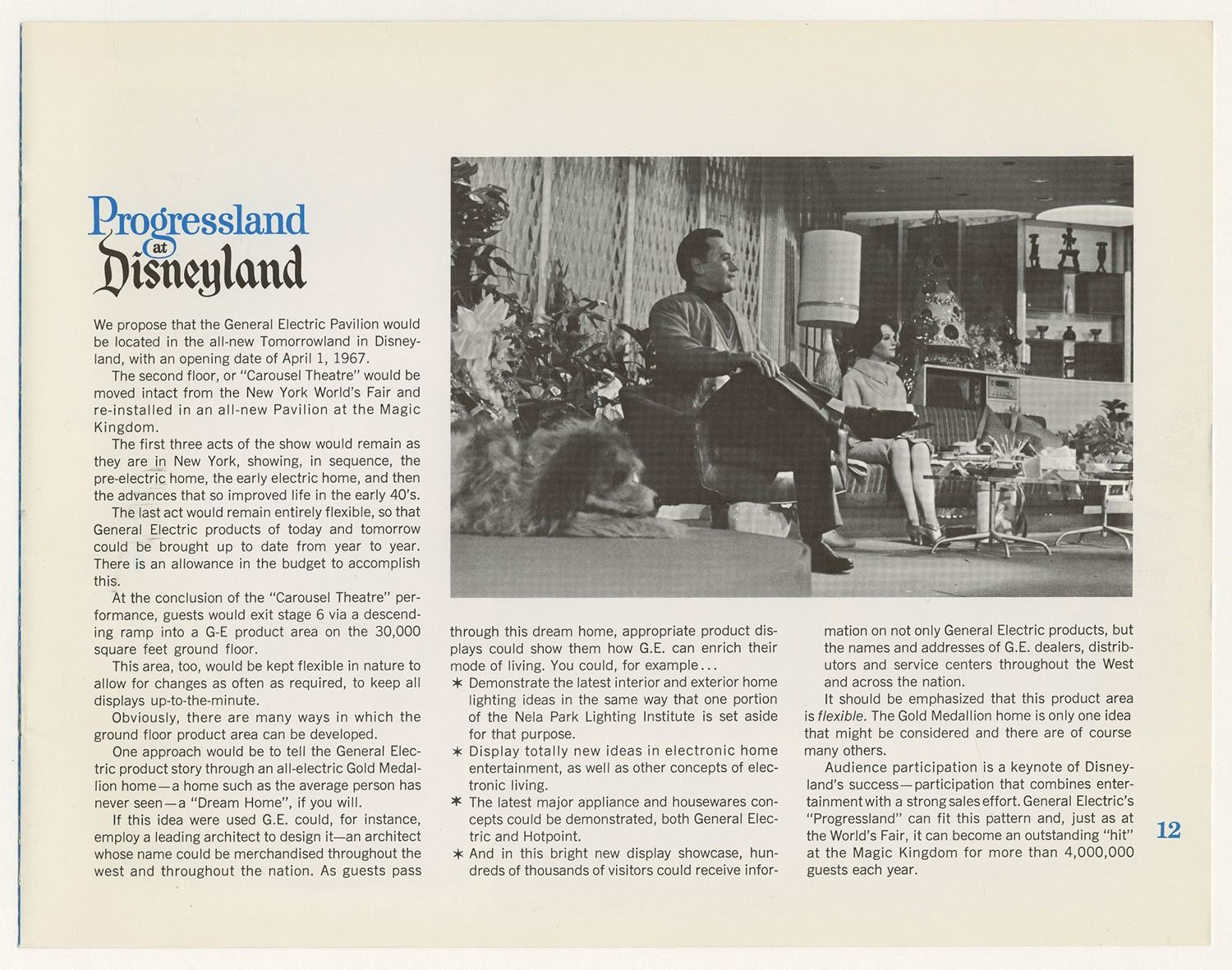 (Disneyland, 1965) An extremely rare booklet made for executives at General Electric. The booklet was designed to convince them on the idea of the continued sponsorship and relocation of the World’s Fair's Carousel of Progress attraction to Disneyland. Plans were made early on to relocate the popular World’s Fair attraction from its temporary home in New York to a newly designed show building in Disneyland when the Fair concluded. General Electric agreed to continue sponsorship and pay moving and re-installation costs for the next phase of the attraction. The 27-page book measures 11"x8.5" and is in fair condition moderate cover wear from use, primarily to the back cover. One of the center pages is loose but included.