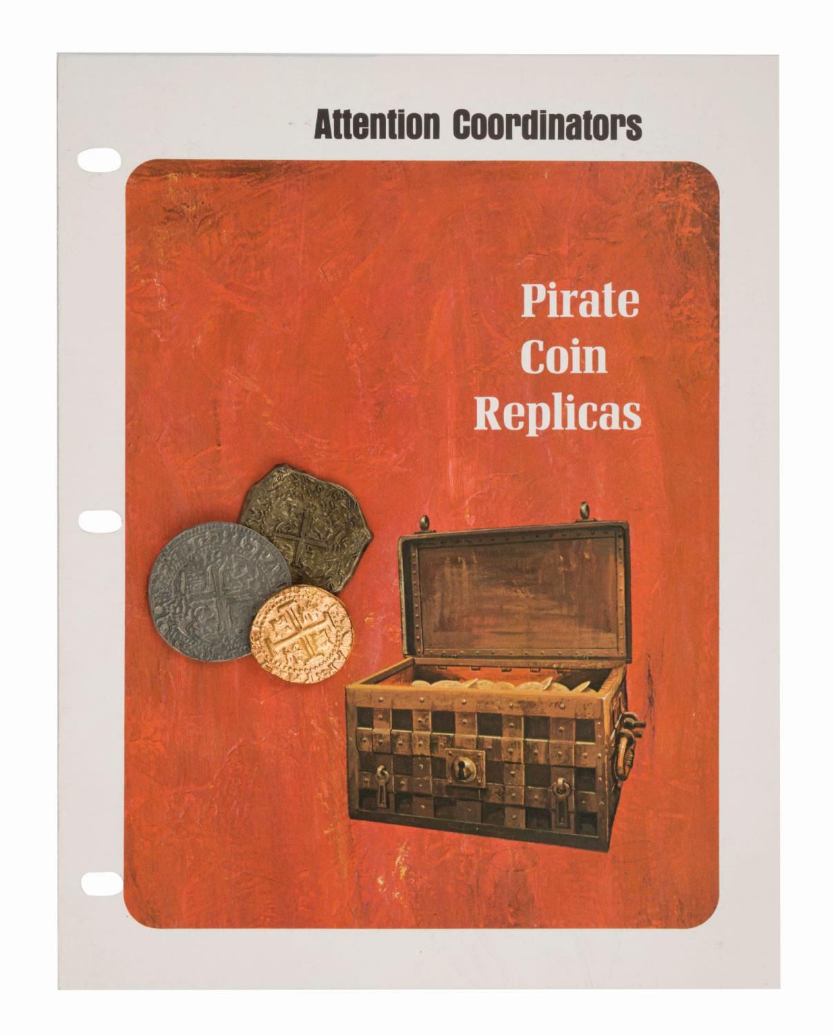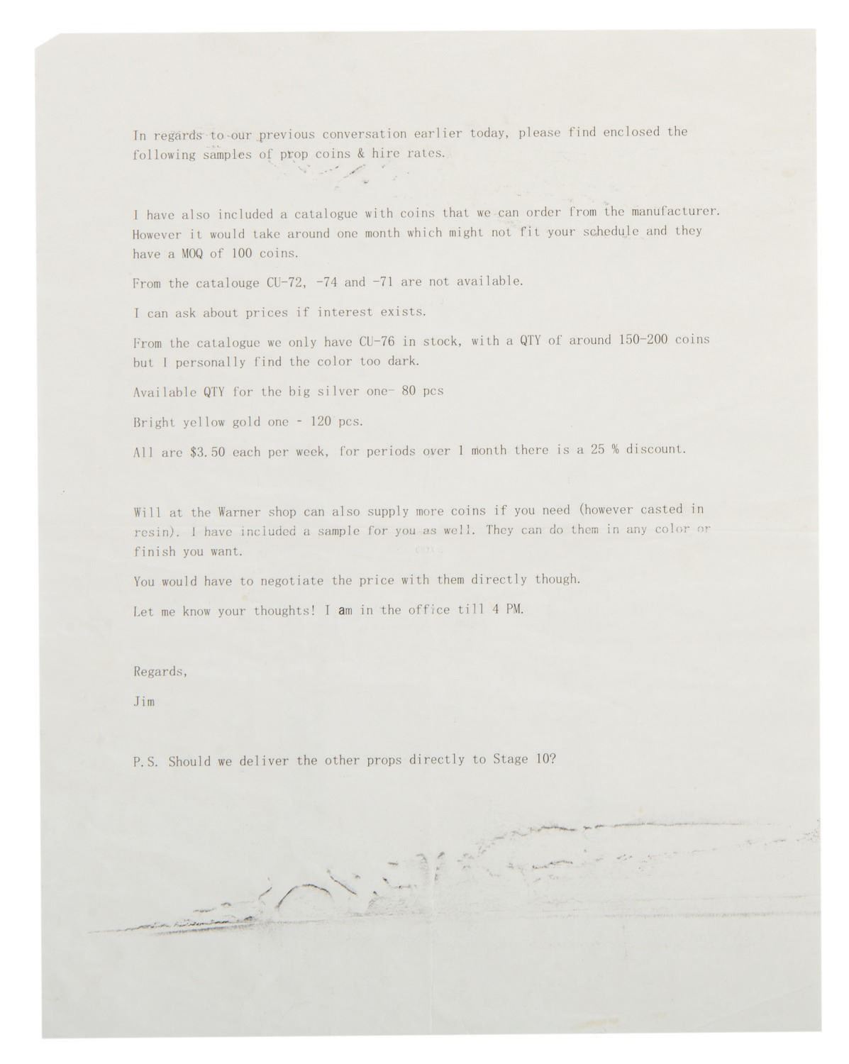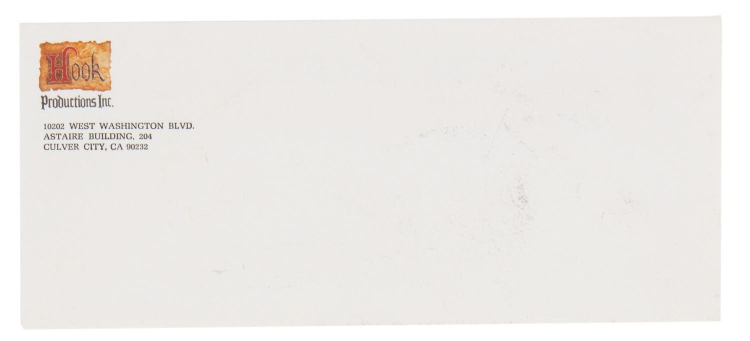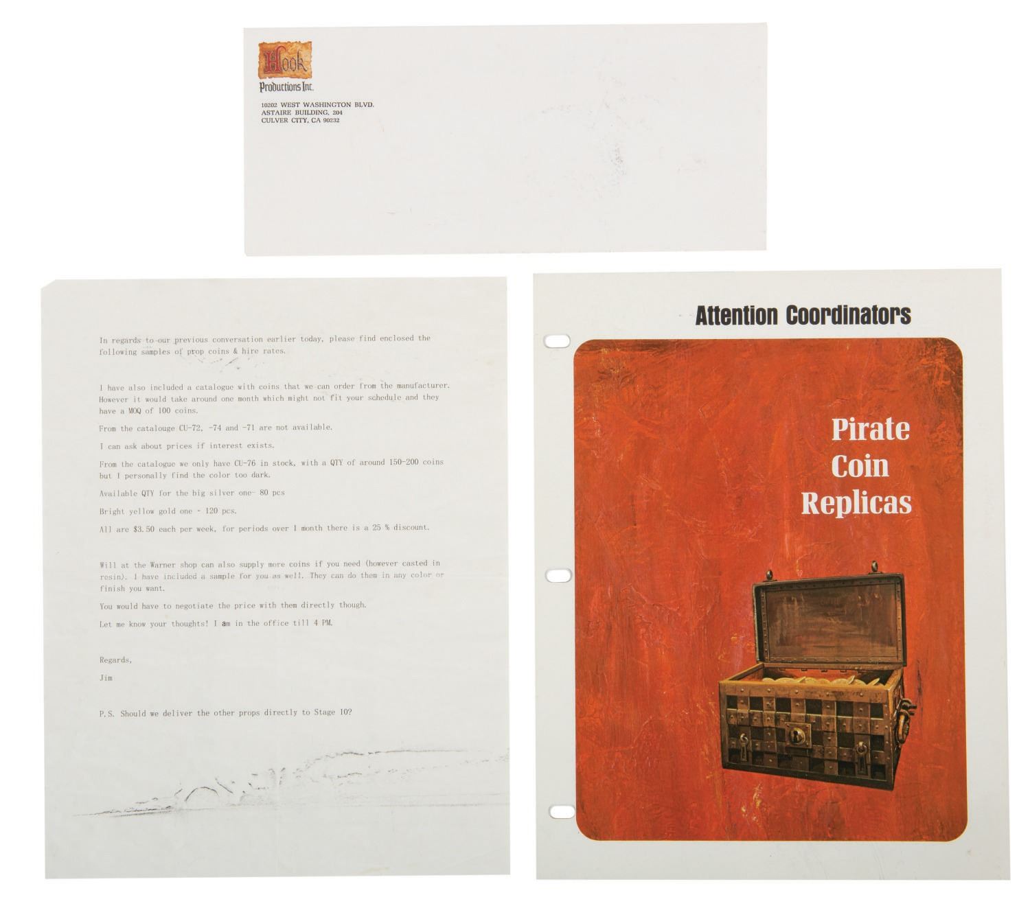 (TriStar Pictures, 1991) A coin prop brochure and (3) sample coins accompanied by a letter from a supplier preparing for the production of Steven Spielberg's "Hook." Much of the film was shot at Sony Pictures Studio and the letter refers to Stage 10 where Captain Hook's Ship cabin was filmed. Measuring 11"x8.5" and approximately 4.25"x9.5", the letter, Pirate Coin Replicas brochure, and envelope with Hook Productions logo are in very good used condition.