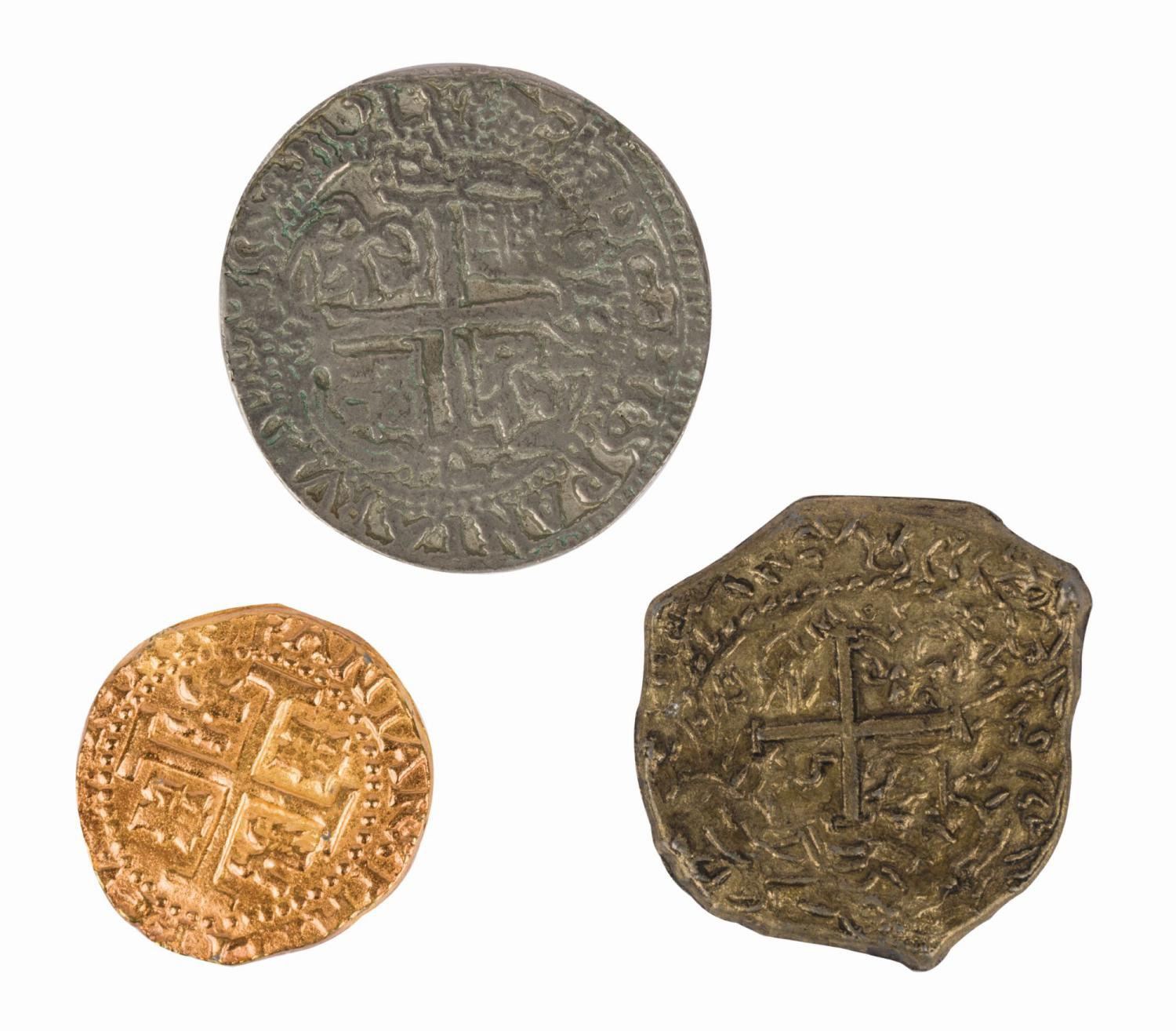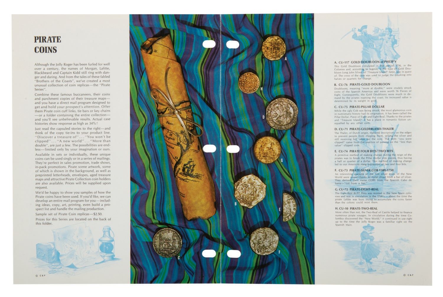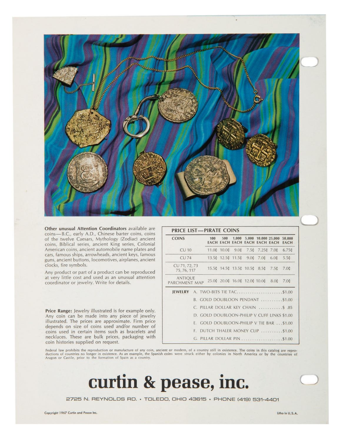(TriStar Pictures, 1991) A coin prop brochure and (3) sample coins accompanied by a letter from a supplier preparing for the production of Steven Spielberg's "Hook." Much of the film was shot at Sony Pictures Studio and the letter refers to Stage 10 where Captain Hook's Ship cabin was filmed. Measuring 11"x8.5" and approximately 4.25"x9.5", the letter, Pirate Coin Replicas brochure, and envelope with Hook Productions logo are in very good used condition.