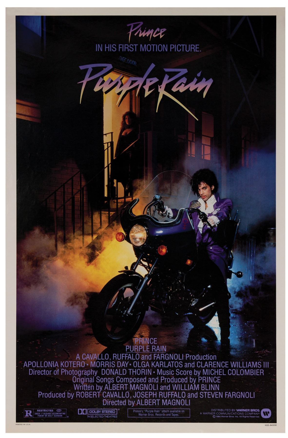 (Warner Bros., 1984) An original one sheet poster from the theatrical release of Prince's film debut in Purple Rain. The poster measures approximately 41"x27" and is in very good condition with minor wear including small creases in the corners.