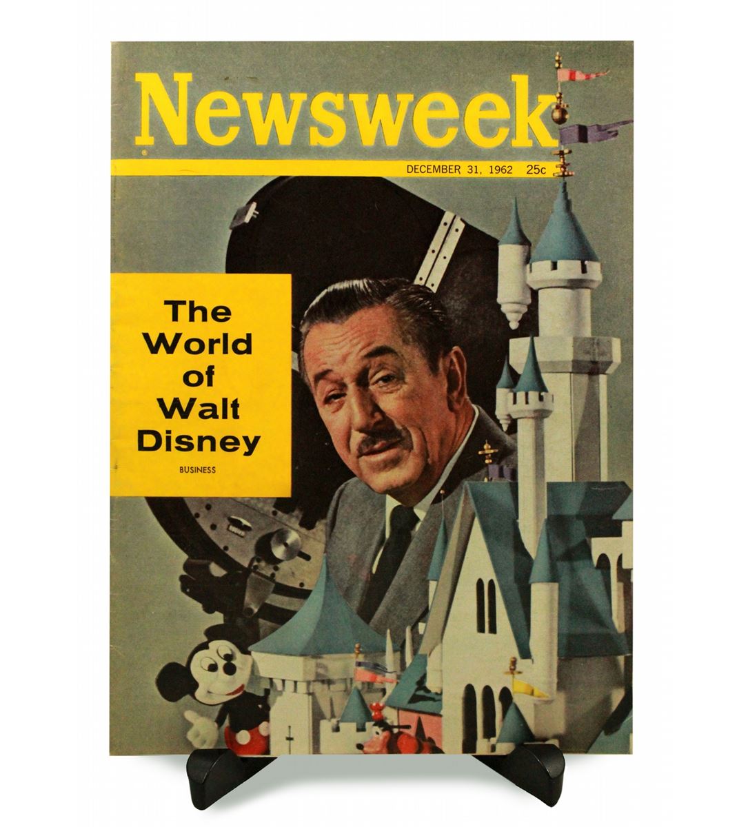 A rare look into the life of Walt Disney, for this Dec 31, 1962 edition of Newsweek, Richard R. Mathison of Newsweek followed Walt Disney on his rounds of Disney Studio, Disneyland, and Walt's home-life. In addition, the magazine covers a wide variety of current events from the area, that provide an intriguing comparison to the rise of Walt Disney, in contrast to the often under-looked economic struggles of the time. In very fine condition, with only mild edge wear and light yellowing of the inside pages.