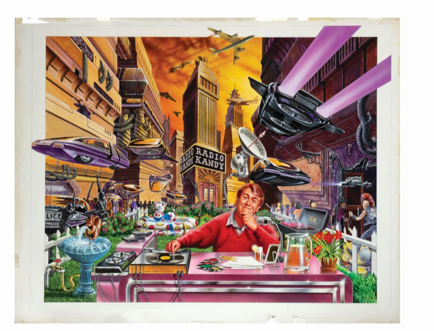 (Candy, 1988) An original painting created for "Radio Kandy," a popular radio program helmed by comedian John Candy. The painting was created by renowned illustrator Peter Green and used for internal radio station promotion. Accomplished in airbrush and acrylic on 21.5"x28.25" art board, the painting is in very good condition with some edge-wear.