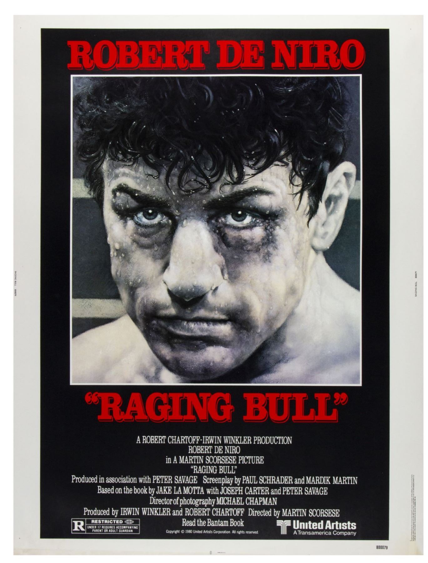 (United Artists, 1980) An original 40"x30" poster for the theatrical release of Robert DeNiro's "Raging Bull". Lithographically printed on cardstock and issued by the National Screen Service, this poster comes from the collection of Bill Wallen and has never been folded, restored, or altered. The poster is in good condition with some wear and yellowing around the edges, including some small tears in the bottom border.