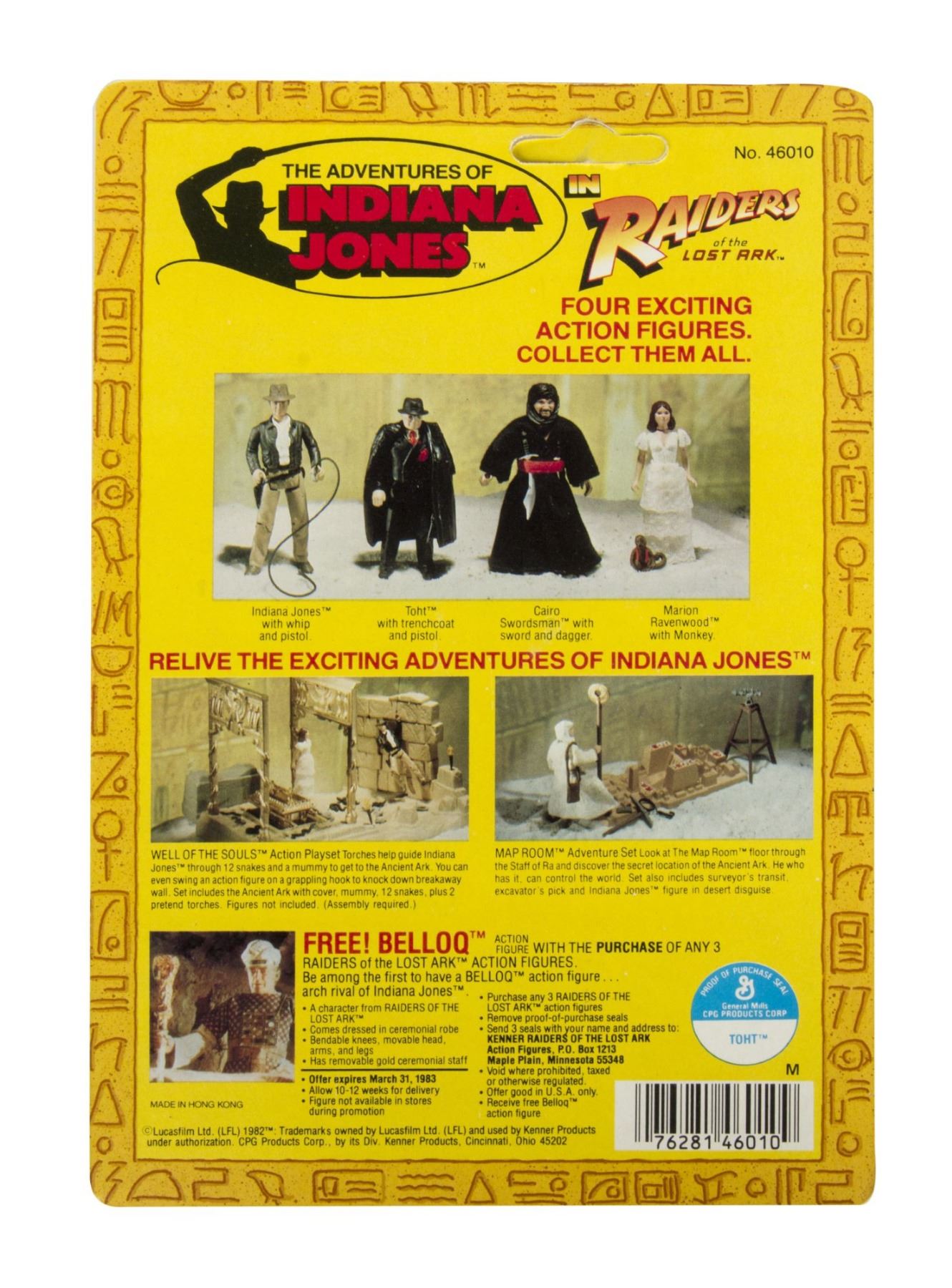 (Kenner, 1982) A very rare "Raiders of the Lost Ark" action figure of the villain Toht. While the film itself debuted in 1981, the first toys for the film didn't appear until 1982 with this line of figures by Kenner. This Toht figure is part of the original 4 figures produced. This action figure is unopened in its original packaging with the Toys 'r' Us sales sticker still adhered to the front. Measuring 9"x6" in its packaging, the action figure is in very fine condition with some minor shelf wear to the packaging from storage.