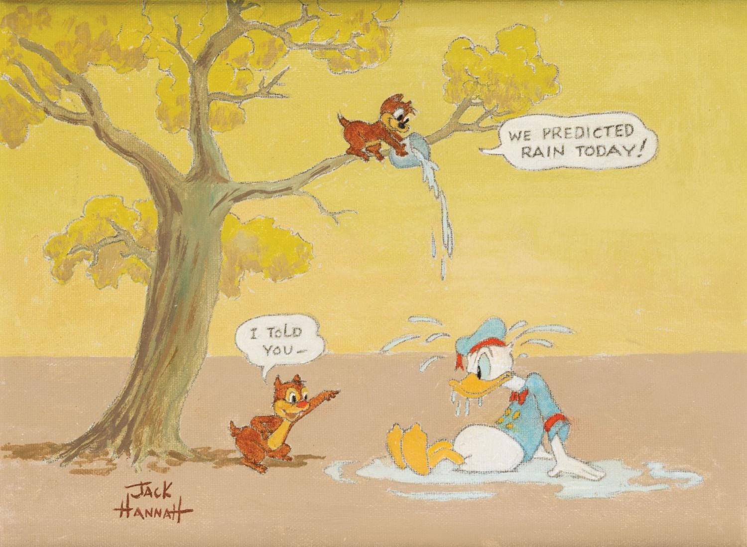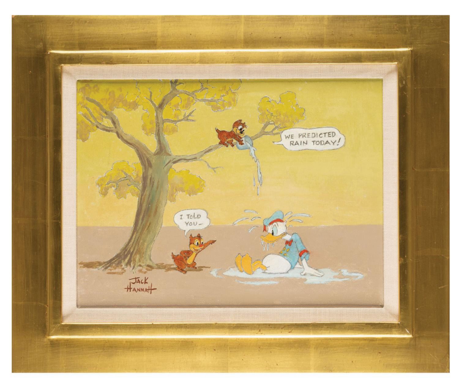 (Disney, 1950s-60s) An original painting titled "Rain Predicted," by Jack Hannah, director of numerous Donald Duck short films from the 1930s to 1960. This painting of Chip and Dale predicting rain in the forecast for Donald Duck, was likely painted by Jack Hannah during his tenure with the Walt Disney Studios. Measuring 9"x11.75", the painting on canvas is in fine condition, mounted and framed for display.