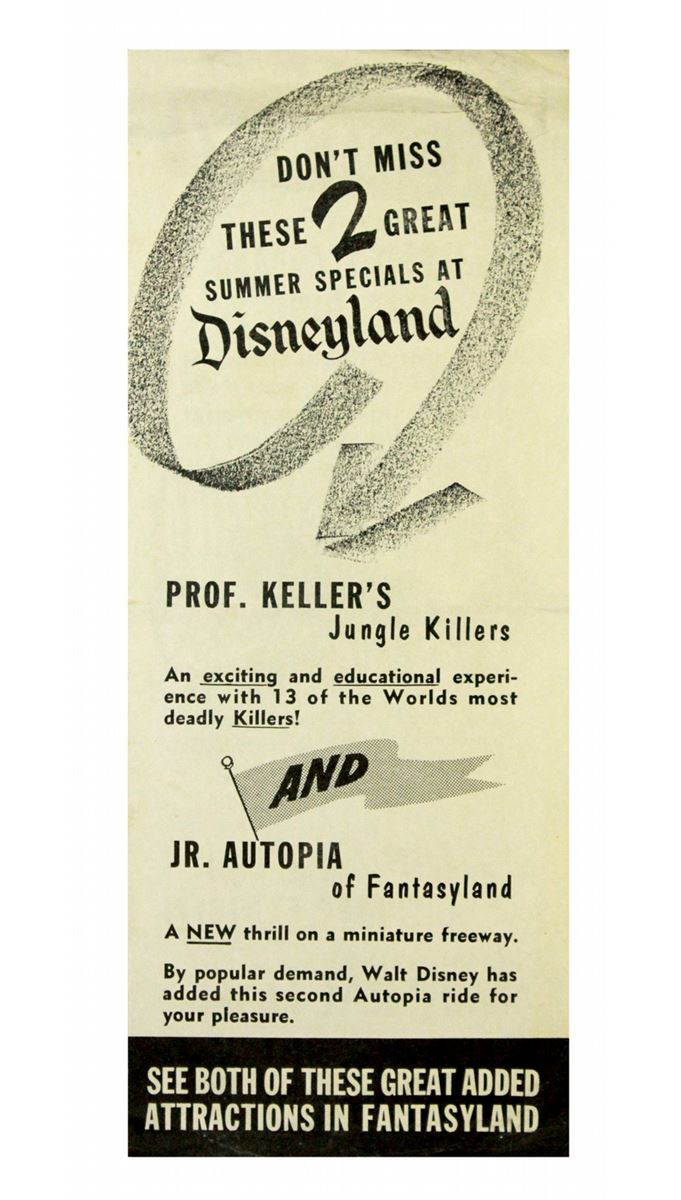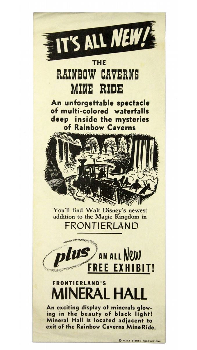(Disneyland, 1956) An extremely rare gate flyer announcing the new attraction, Rainbow Caverns Mine Ride. Two-sided with graphics and also featuring the new Junior Autopia and Professor Keller’s Jungle Killers at the soon to be extinct, Fantasyland Circus Tent. Printed on 10.5 X 4 in. paper. In very good condition.