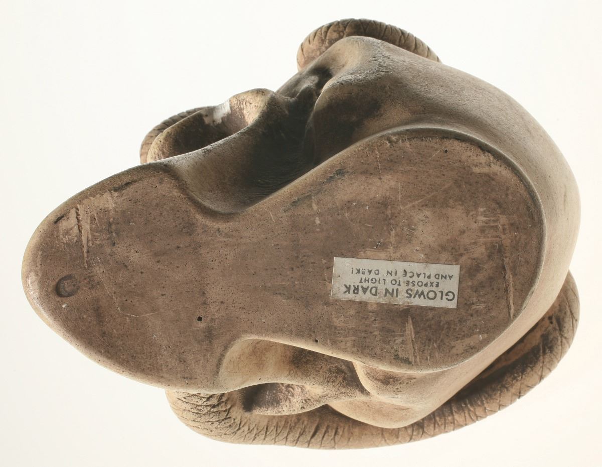 (Disneyland, 1966) Randotti large glow in the dark skull with snake. Light toned with black paint. Measures 5.5"x5.25" and 6.25" tall. In good condition with some wear and chips throughout. Retains its original sticker on the base, signifying that the skull glows in the dark.