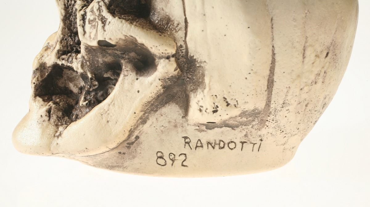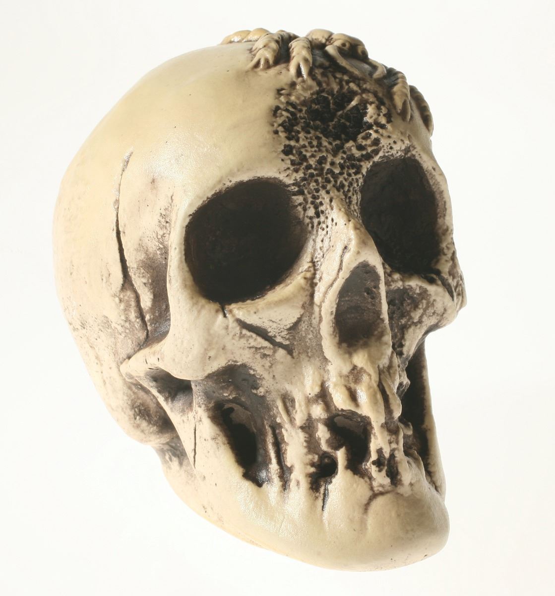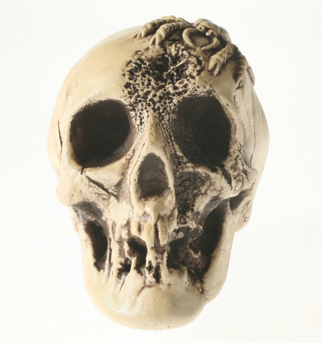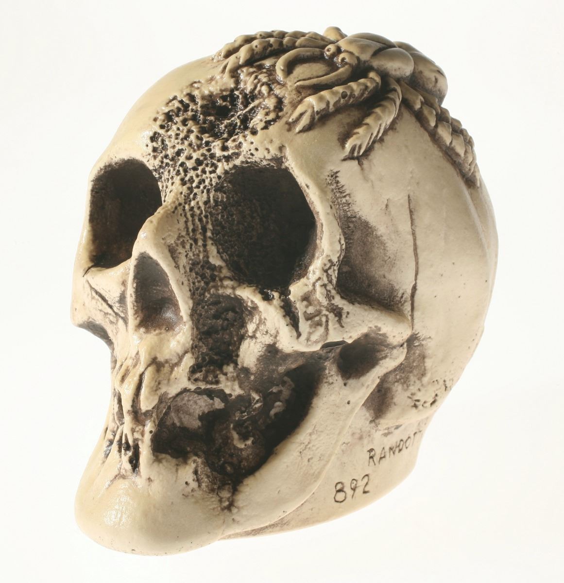 (Disneyland, 1970s) Randotti glow in the dark skull with spider on top. Light toned with black paint. Measures 4"x3" and 3.5" tall. In very fine condition.