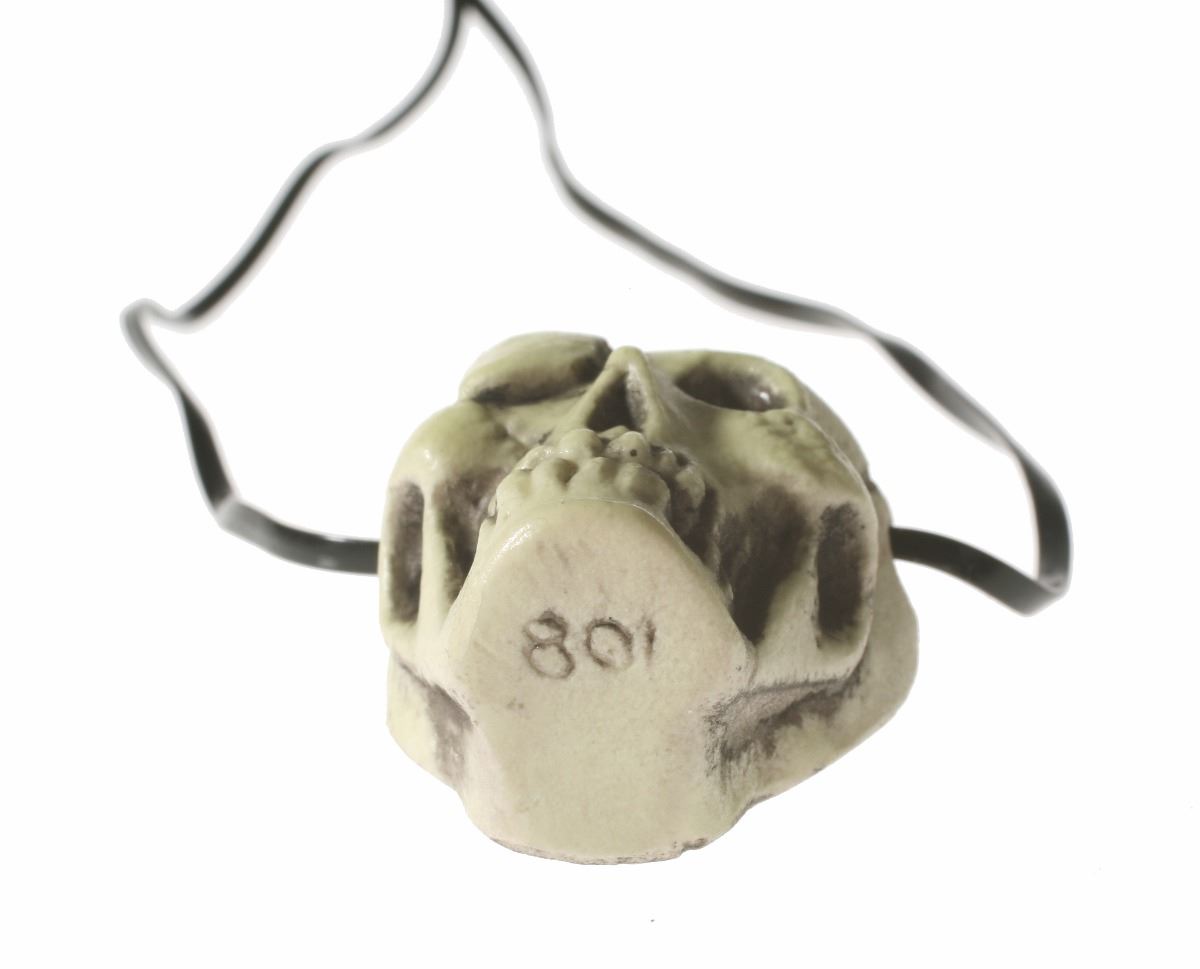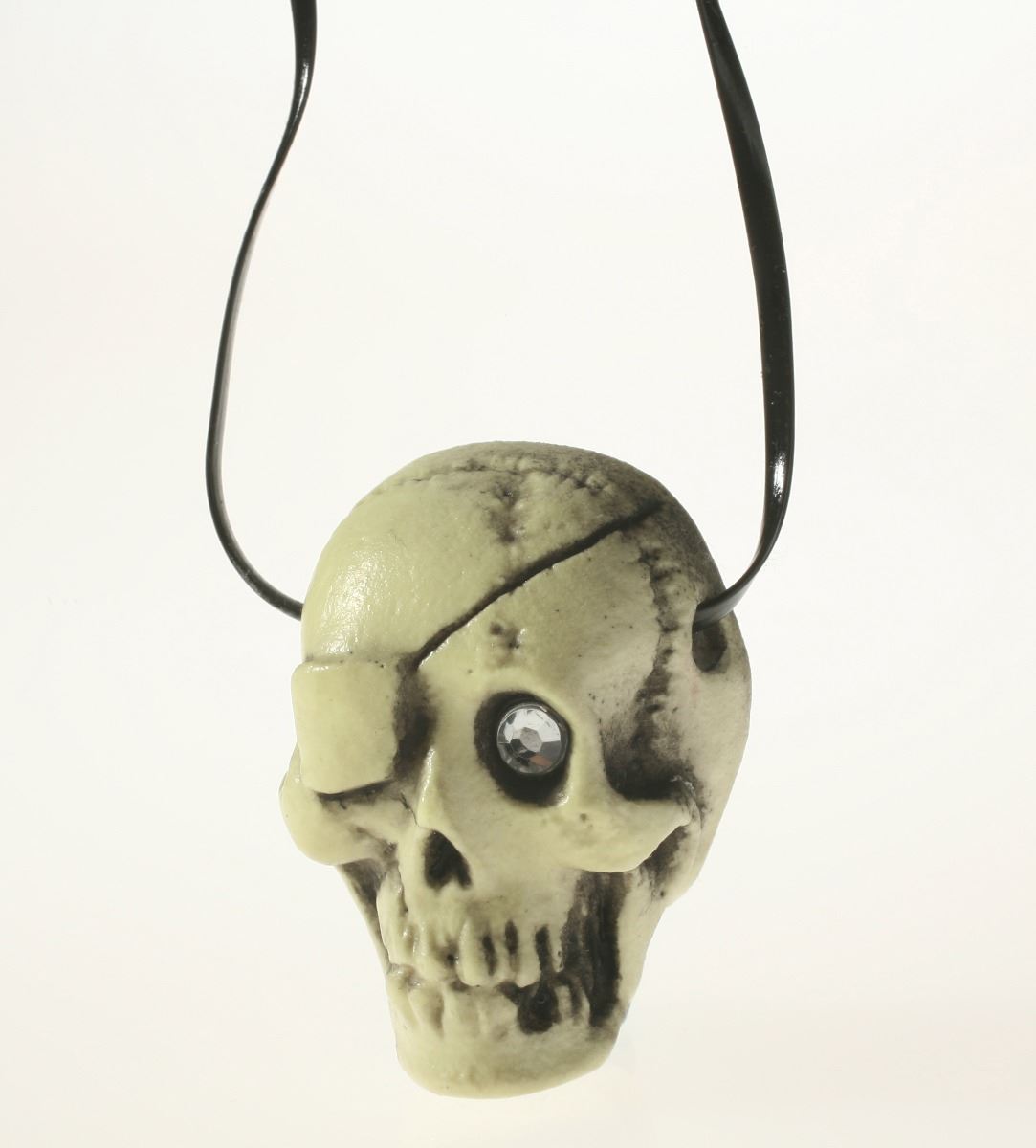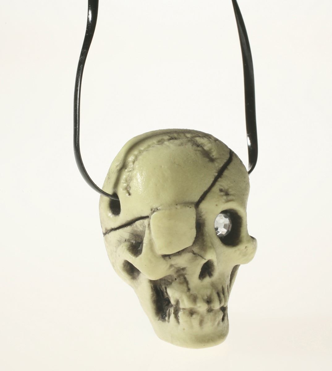 (Disneyland, 1970s) Randotti glow in the dark pirate skull necker with jeweled white eye. Measures 1"x1" and 1.5" tall. In good condition.
