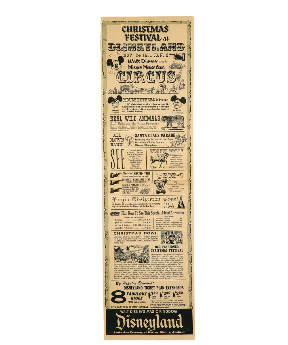 Club Circus for November 24th, 1955 through January 8th, 1956. The 20.75”x5.9” flyer lists all the exciting acts in the Mickey Mouse Club Circus as well as show times. Because the flyer was used at the park for such a limited time, it has become one of the hardest pieces to find. In good condition with a horizontal crease from folding and a 0.5” tear in the center.