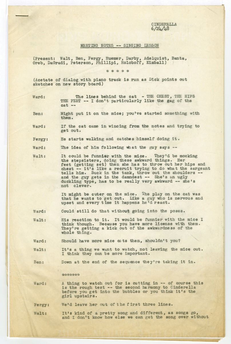 (Walt Disney Studios, 1948) During development of a feature, key story men, animators and directors would meet often to discuss scenes and share ideas. These brainstorming sessions were how scenes were improved or taken away, but also gave Walt a chance to add his own touch to the production in a very real way. The notes for this meeting, dated June 24th, 1948, deal with the singing lesson and subsequent "Bubble Song" from Cinderella. These minutes to the meeting show where the story and scene were heading almost two years before production finished. The last page also states that only six copies of these notes were made. A fascinating read and an amazing look at the behind-the-scenes workings of the studio, with unedited dialogue directly from the mouth of Walt Disney and his closest team of story men and animators. Measures 13"x8.5". 20 pages. In very good condition with some edge-wear.