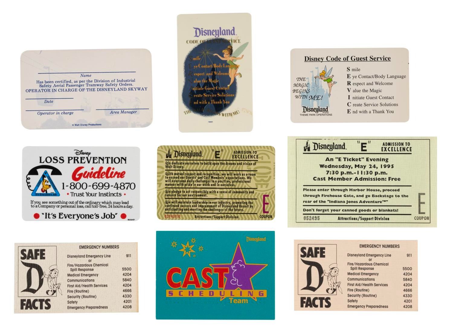 (Disneyland, 1980s) A collection of nine Disneyland Cast Member Cards. These unique cards were issued to Disneyland Cast Members. Included are a Disneyland Skyway Operator Card, (2) Safe D Facts cards, (2) Admission to Excellence cards, (2) Disneyland Code of Service cards, a Loss Prevention Guideline card, and a Cast Scheduling card. Measuring from 2.5"x4.25" and 2"x3.5", each card is in very good to fine condition with some wear.