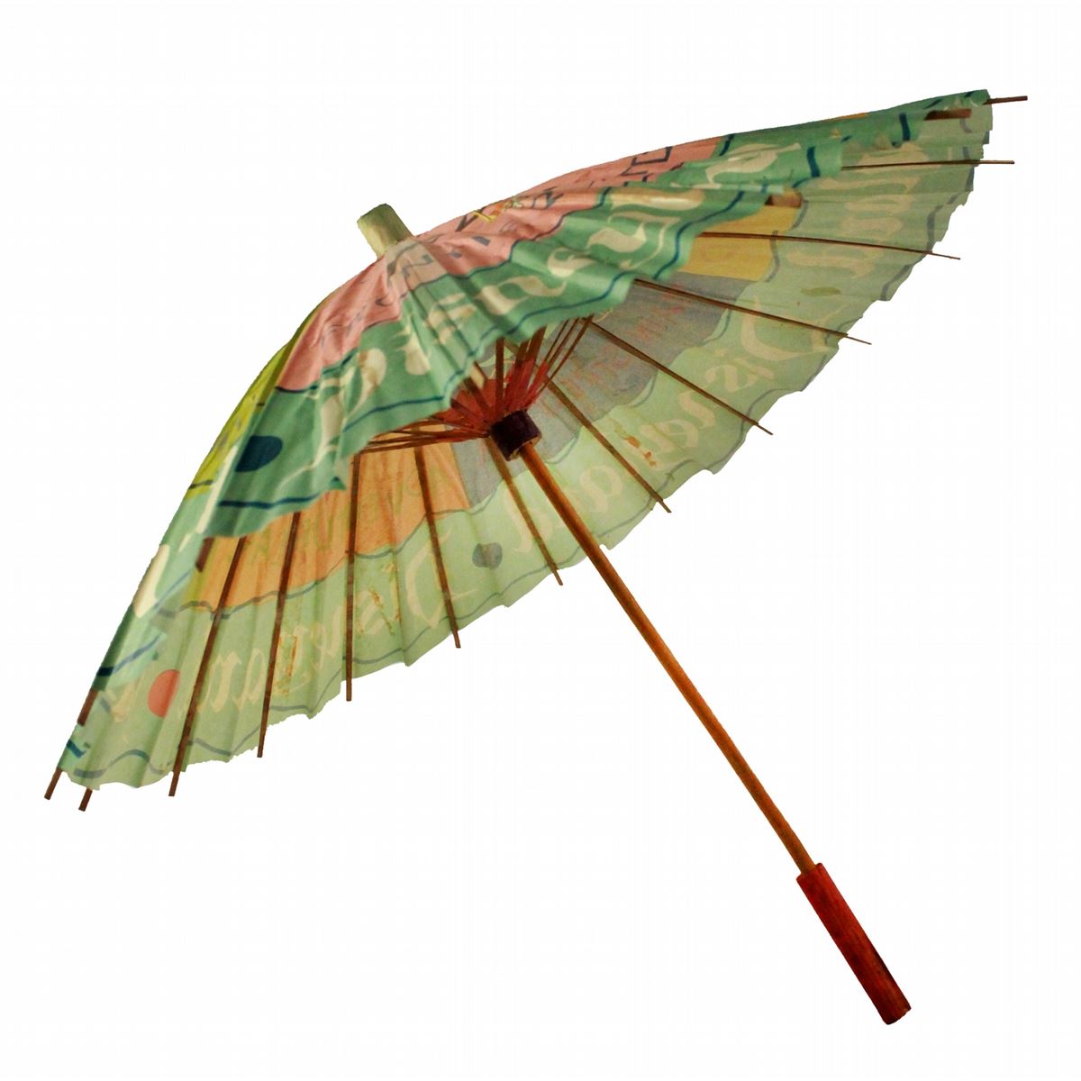 (Disneyland, 1955) Incredibly rare and equally fragile Disneyland souvenir Japanese paper parasol. These ephemeral items sold on Main Street, were made to help park guests gain shelter from the sometimes brutal California sunshine. The color and styling is absolutely superb. Measuring 16 x 22 in. when opened. In very good working condition for its’age.