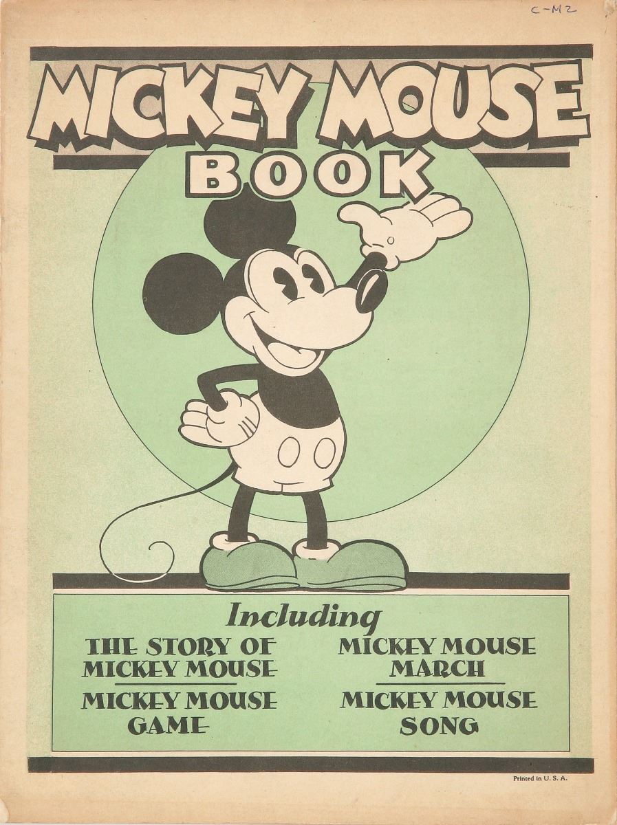 (Bibo and Lang, 1930) This extremely rare first printing of the "Mickey Mouse Book" is entirely intact, including the cut-out game on page 9 which is often missing. The book is stamped on the title page with the name and address of its original owner in two places and marked with his name in ink, Murray A Harris. Also marked "C-M2" on the upper right corner in ink. Measures 12"x9". 15 pages. In very good condition with some age toning.