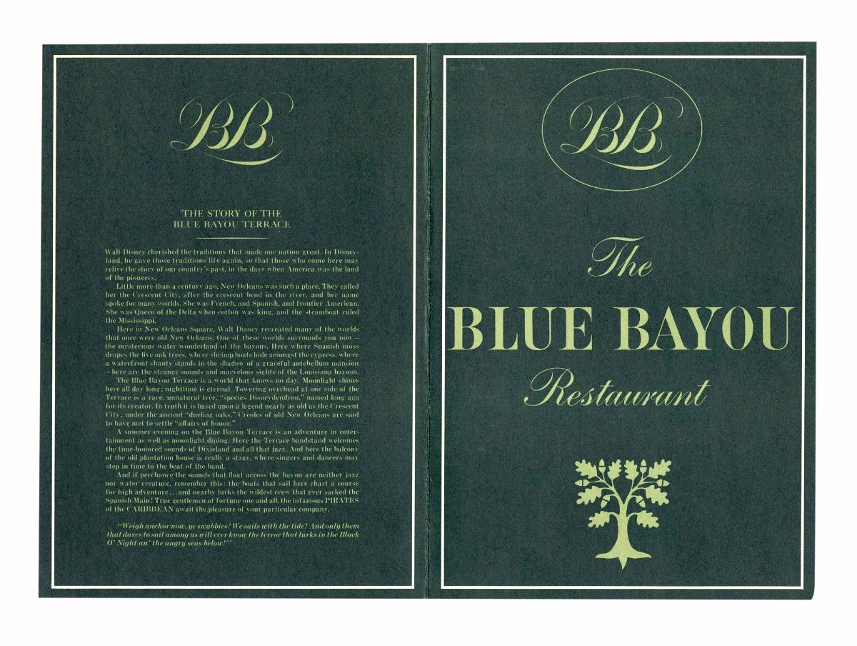 (Disneyland, 1967) Rare menu from the first year of operation of the Blue Bayou restaurant in the "Pirates of the Caribbean" attraction. Opening in 1967 along with the attraction, the restaurant was an answer to criticism to the quality of food in the park. Measures approximately 12"x9.5", closed. In very good condition.