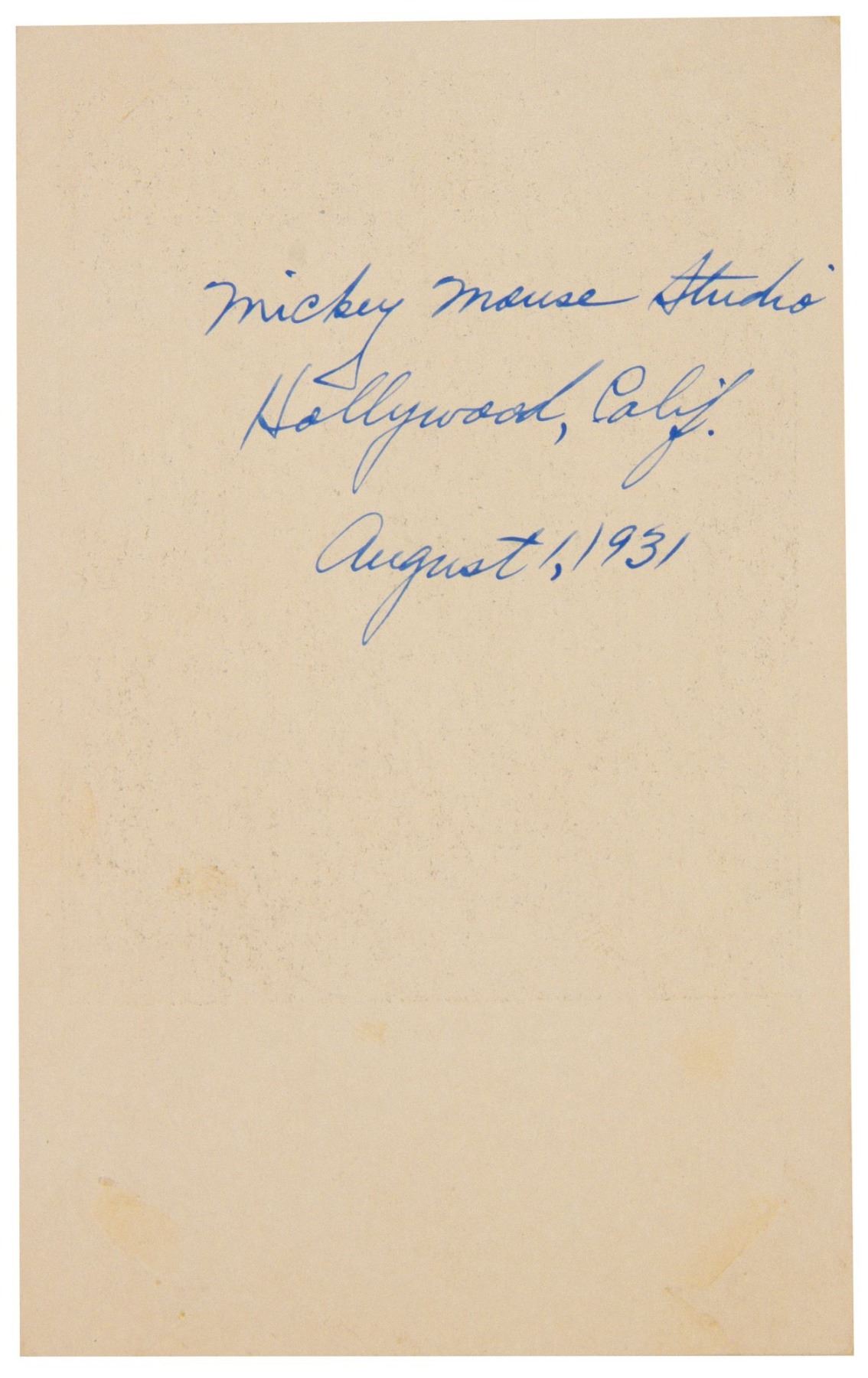 (Walt Disney Studios, 1931) An extremely rare fan card that was offered by newspapers as a premium to their readers in the late 1930s and 1931. This card features Mickey Mouse posing for a photo with Butch disguised in armor behind him. Butch was a friend of Mickey's who was introduced in the "Mr. Slicker and the Egg Robbers" storyline of the Mickey Mouse comic strip in late 1930. The facsimile signature along the bottom reads "Gobs of Good Wishes, Mickey Mouse" as well as "Me too, Butch". The card measures approximately 5.5"x3.5" and is in very good condition with little wear. The back side has the note "Mickey Mouse Studio, Hollywood, Calif, August 1, 1931" in ink from the card's original owner. This is one of the earliest fan cards we have seen and the only one of this particular image we have ever seen offered.