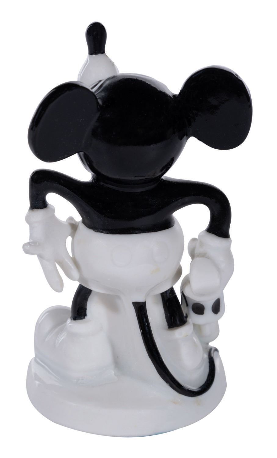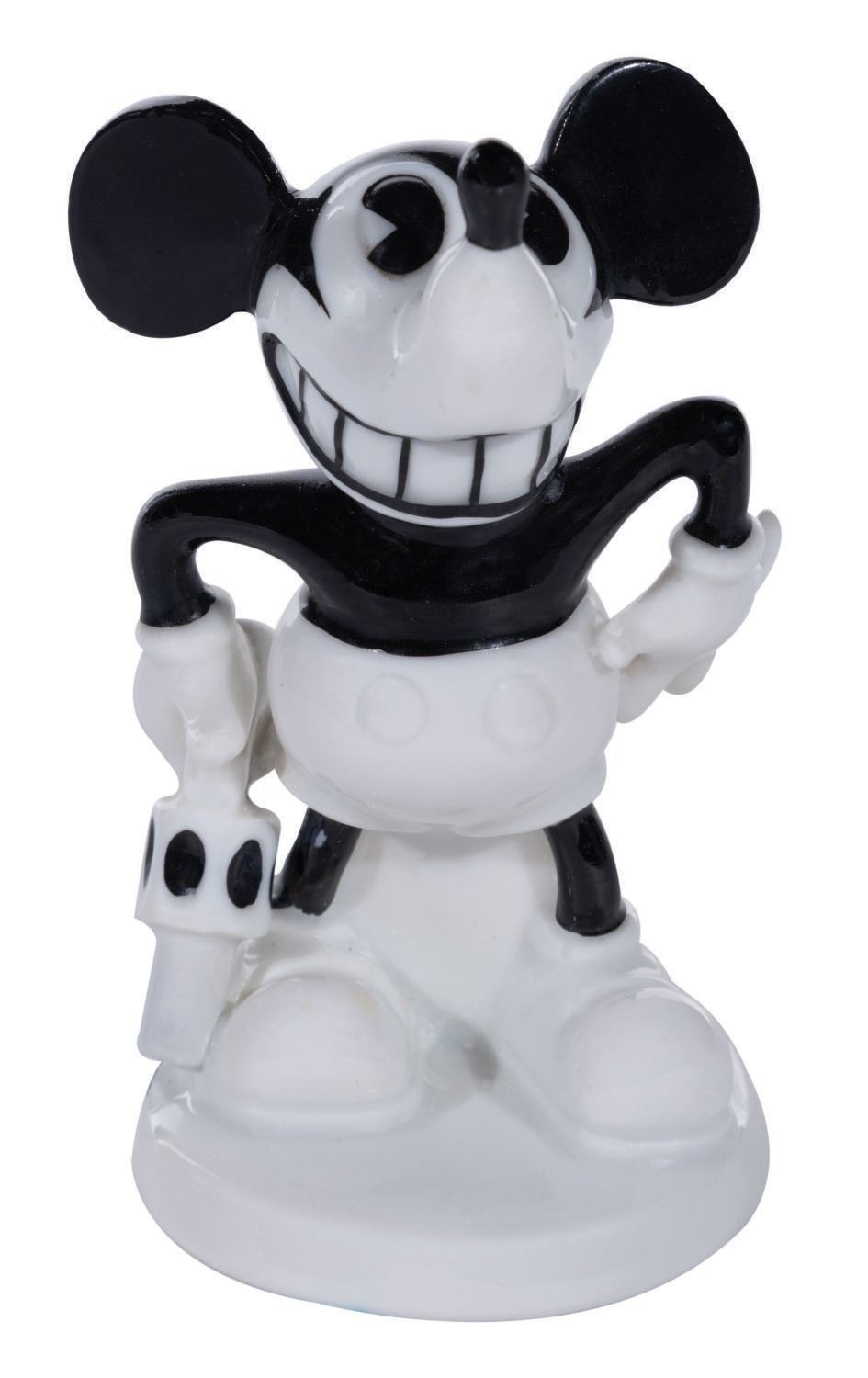 (Rosenthal, 1932) An extremely rare porcelain figure of Mickey Mouse produced by Rosenthal of Bavaria in the 1930s. All Rosenthal figures are rare as they were never distributed in the United States. They are considered to be the finest Mickey figurines ever produced. Mickey stands 3.25" tall. This is #552 in the series and has the Rosenthal company mark and the original "Mickey Maus" sticker under the base. The sticker translates to "Mickey Mouse Brings Luck To Your House." In very fine condition.