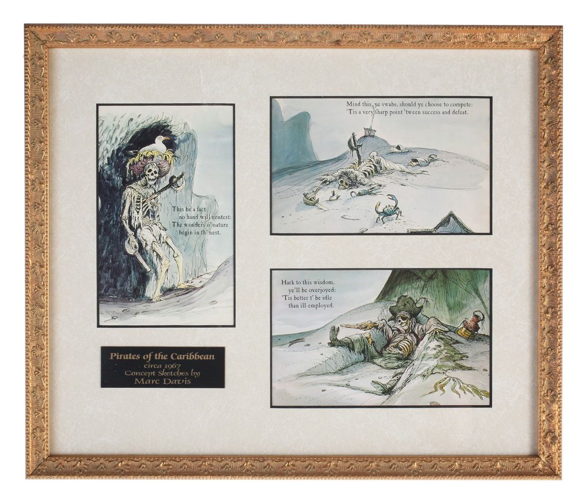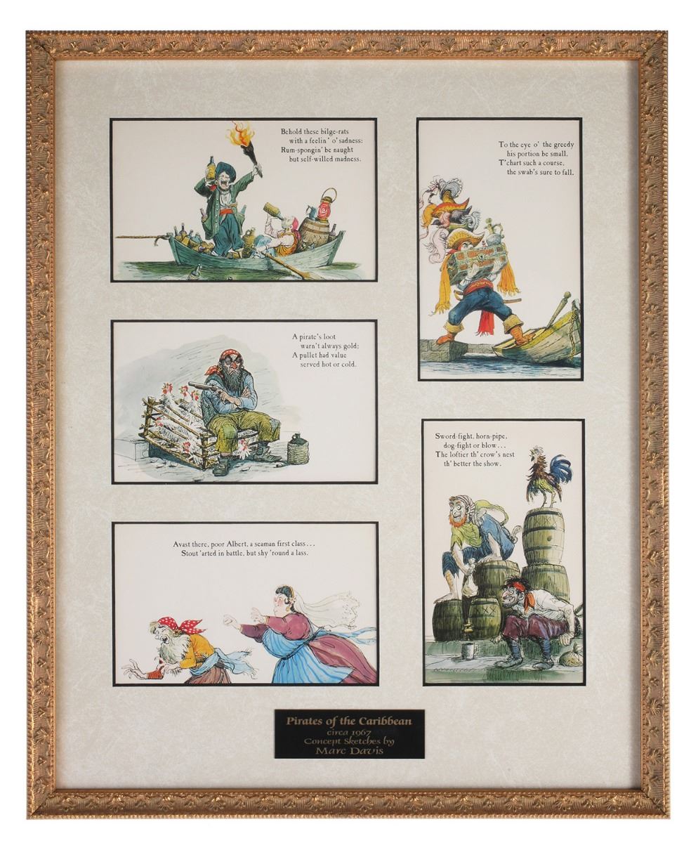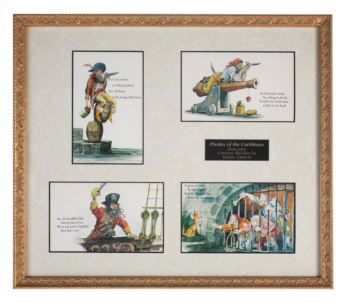 (Disneyland, 1967) Extremely rare complete set of the first postcards issued for the "Pirates of the Caribbean" attraction in 1967. Walt Disney was so taken with Marc Davis' concept paintings for the attraction, he insisted that Davis' actual artwork be used in the promotions leading up to the attraction's opening. Walt commissioned the "Pirates of the Caribbean" souvenir program and this set of (12) postcards before his death. The cards were available in only one place in the world; a custom vending machine in the "Pieces of Eight" shop at the exit to the attraction. Complete sets are quite rare, and this set has been beautifully presented in three separate frames. Each card is in fine unused condition.
