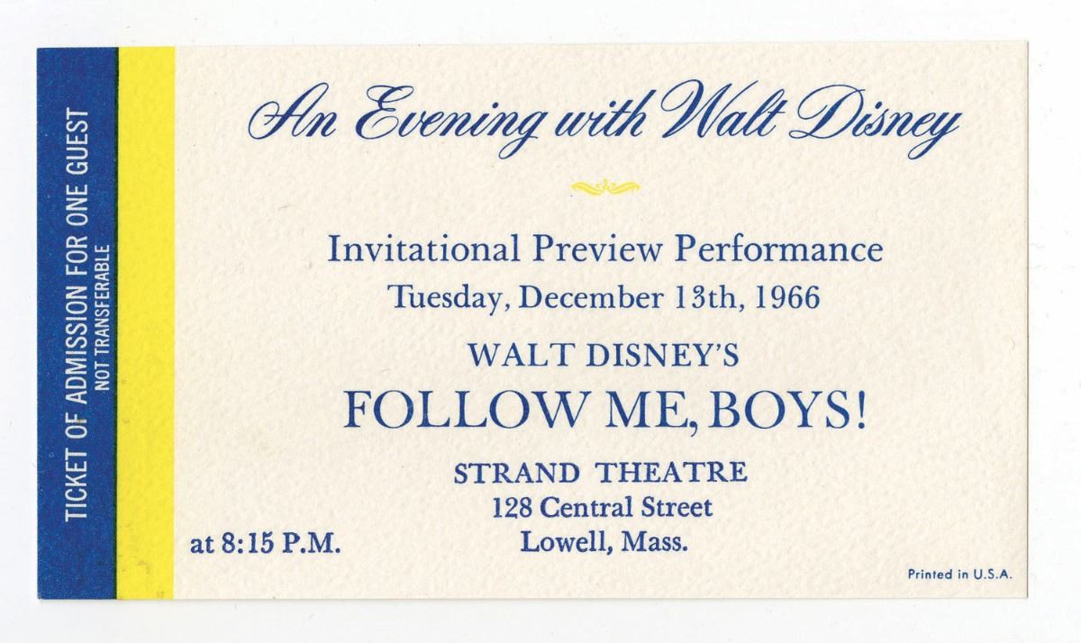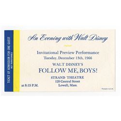 (1966) Rare ticket for the scheduled premiere of "Follow Me Boys" and an appearance by Walt Disney. However, Disney was diagnosed with cancer in November of 1966, and died on December 15th, 1966 and the ticket was never used. Measuring 5"x2.5" in fine condition with envelope.