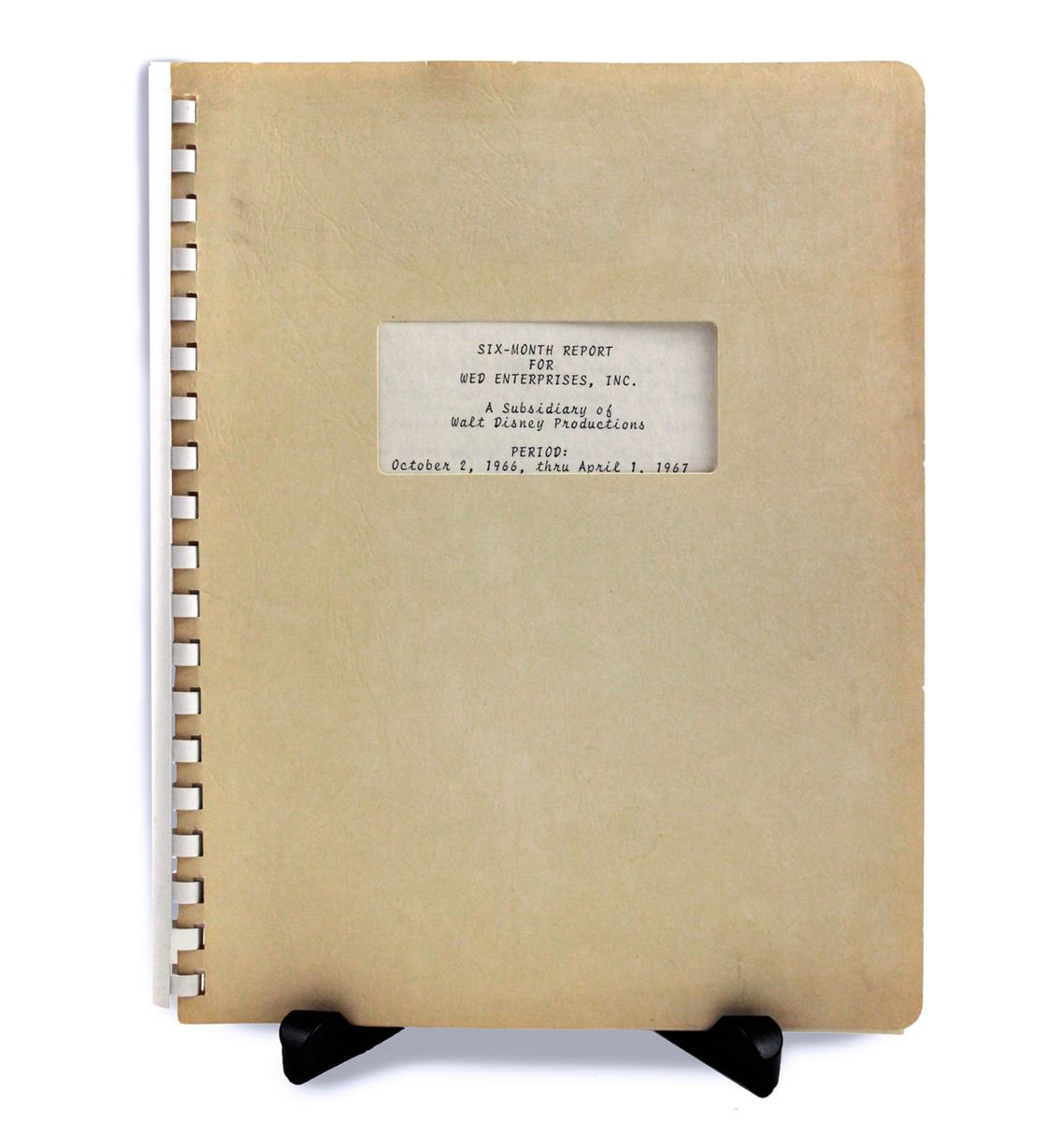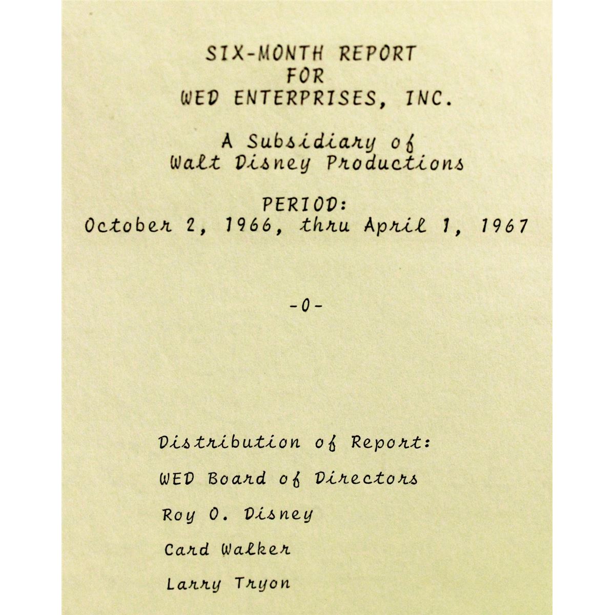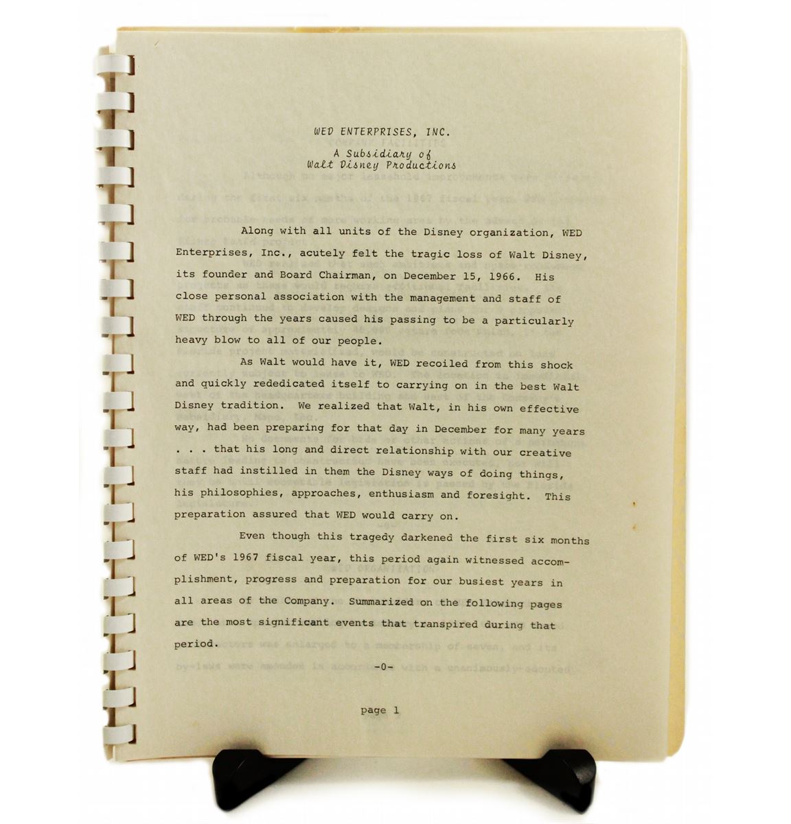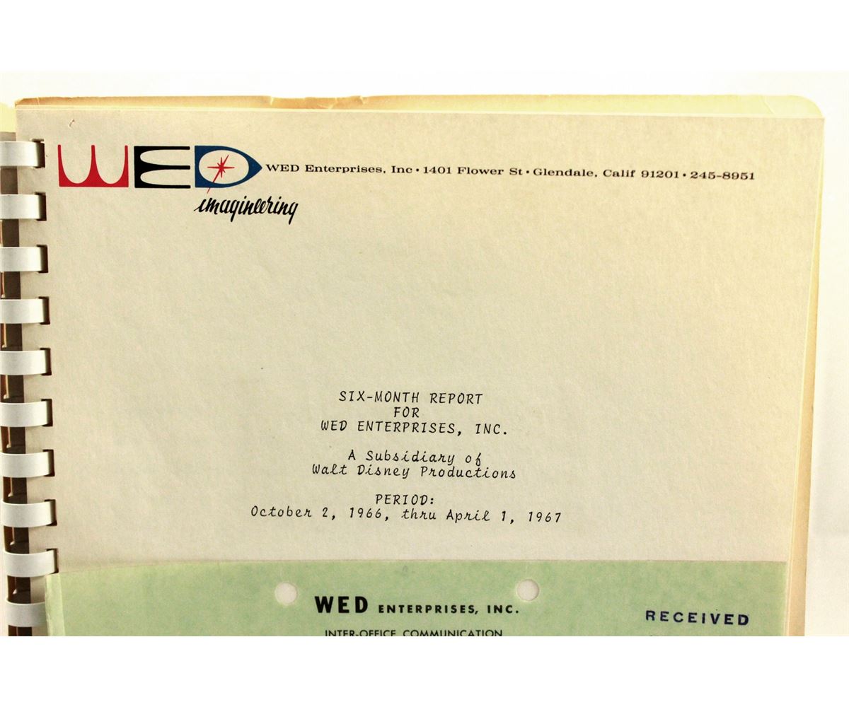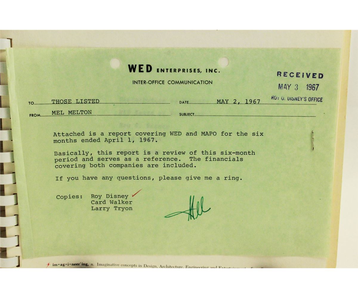 (WED, 1966-67) Roy Disney’s personal copy of a seventeen page report prepared by Imagineering President Mel Melton. The report, prepared and distributed only to the top executives at the company, covers the period of October 1966 thru the start of April 1967. A working assessment of events for both WED and MAPO in the prelude and aftermath of Walt Disney’s death, it covers the emotional and organizational blow to the divisions while reporting the progressive strategies of current projects. It begins with a WED inter-office communication sheet signed by Mel Melton and stamped ‘received’ by Roy Disney’s office. It discusses Walt’s death, its impact to the divisions and how the company, in Walt’s memory, should continue with the spirit of “the show must go on.” The Disney World Florida Project” is mentioned. Current status on projects such as, Pirates of the Caribbean, Club 33, the New Tomorrowland expansion including, Adventure Thru Inner Space, Flight to the Moon, Carousel of Progress, America the Beautiful and the Goodyear Peoplemover are included. Also covered is the Disney World project and Walt’s plans for EPCOT, citing his proposal which was demonstrated in his final film pitch of the project. The Mineral King project is also covered. A time-capsule document of a tumultuous period in the history of WED and Disneyland. Measuring 9 x 11.25 in.