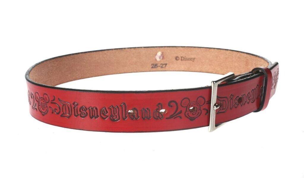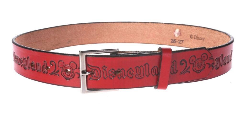 (Disneyland, 1960) A red leather belt with "Disneyland" written across the surface along with images of Mickey Mouse. This item measures 1.25" in height and is stamped size "26-27". This item is in good condition with little wear.