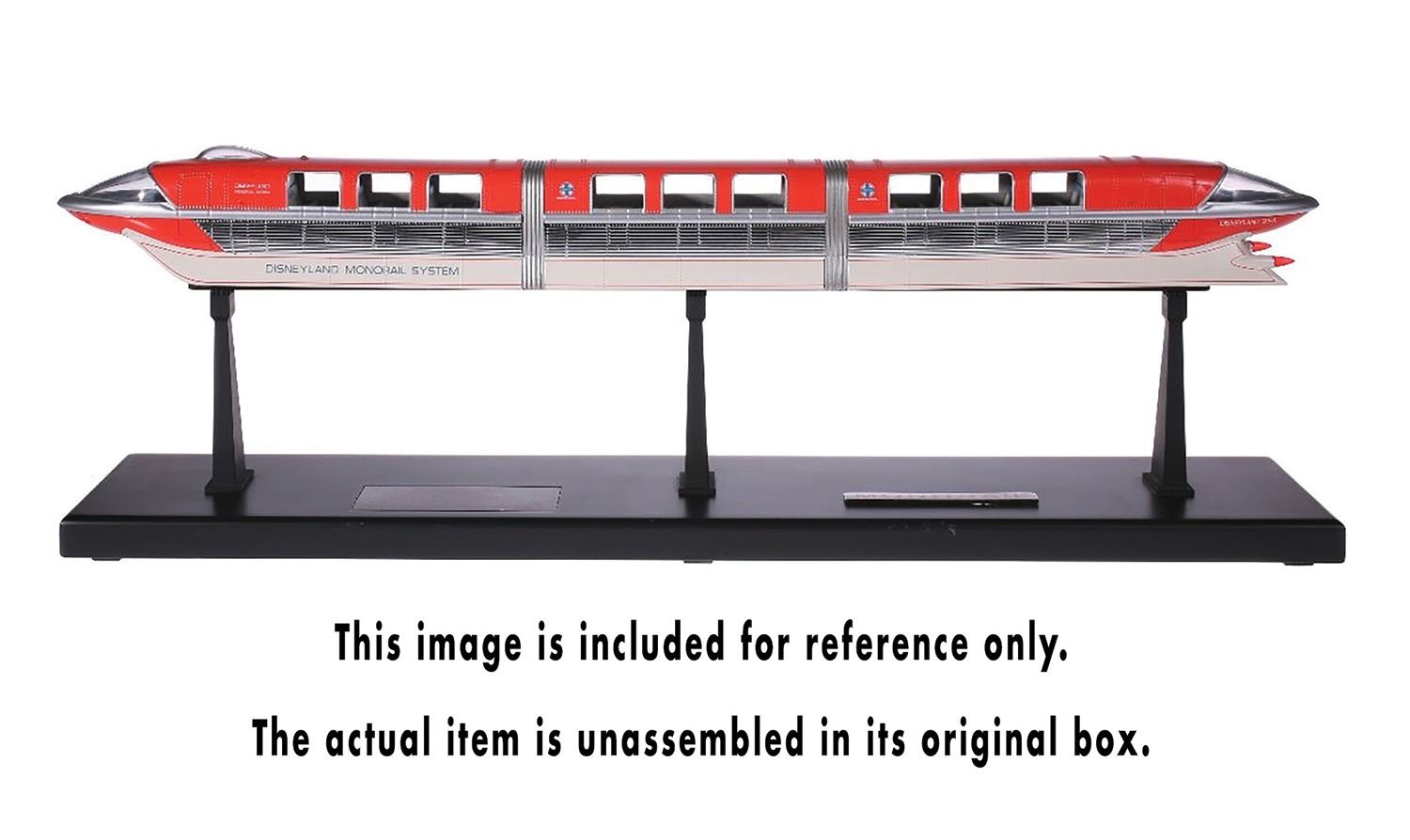 (Disneyland, 2005) A limited edition Monorail model created as part of Disneyland's 50th anniversary by artists Will Babington and Rich Allsmiller. This O-scale red model Monorail was made for Master Replicas based on Imagineer Bob Gurr’s original 1959 design. Complete with working headlights, taillights and top beacon, the die-cast replica with custom display stand was released in an edition size of only 1959 pieces and comes with the Certificate of Authenticity. The set is also accompanied by a Monorail Pin that fits inside the stand. The monorail itself measures 22” long and the stand approximately 22” long and 4.15” wide. The pieces in as-new near mint condition, retaining their original packaging with the original 9”x27” and 8” deep factory box.