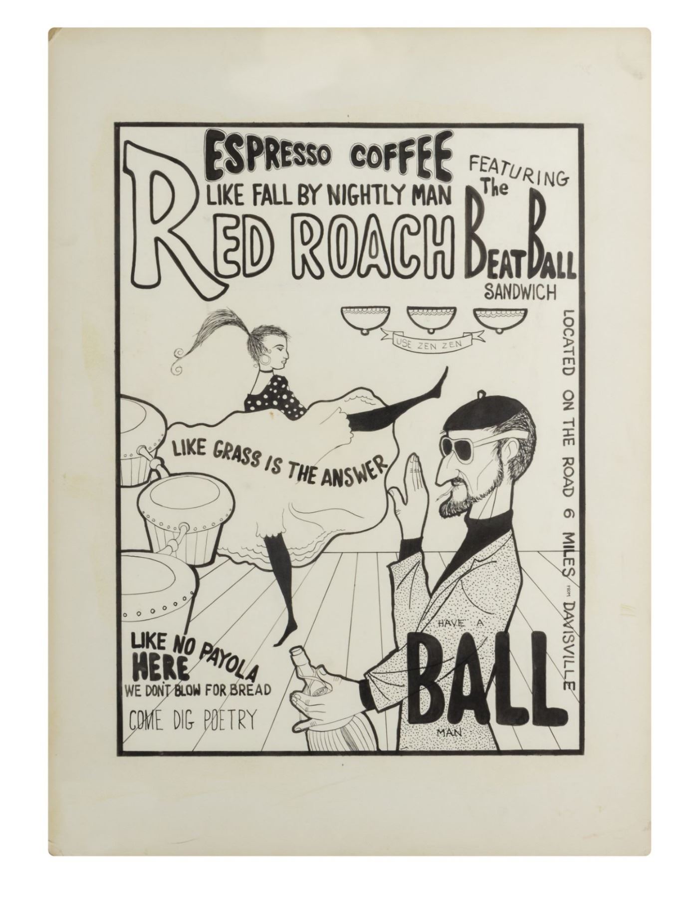 (c.1957-60s) An original illustration by Rolly Crump for the fictitious "Red Roach" restaurant. This humorous artwork reads "Like Grass is the Answer" and is accomplished in ink on artist's board. The illustration has an image size of 20"x14.5" within its 22"x16.75" frame. The condition is very good with minor edge-wear.