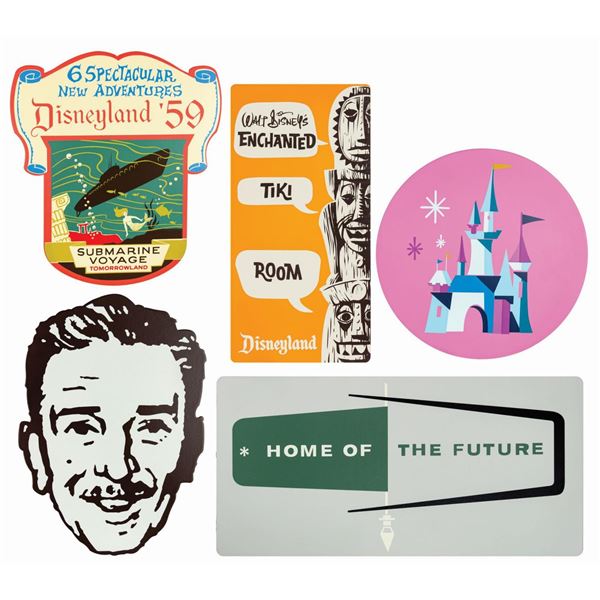 (Disneyland, 2005) A set of (5) metal signs featuring Disneyland icons and attractions. Created in a limited edition of 1000, the die cast tin metal s