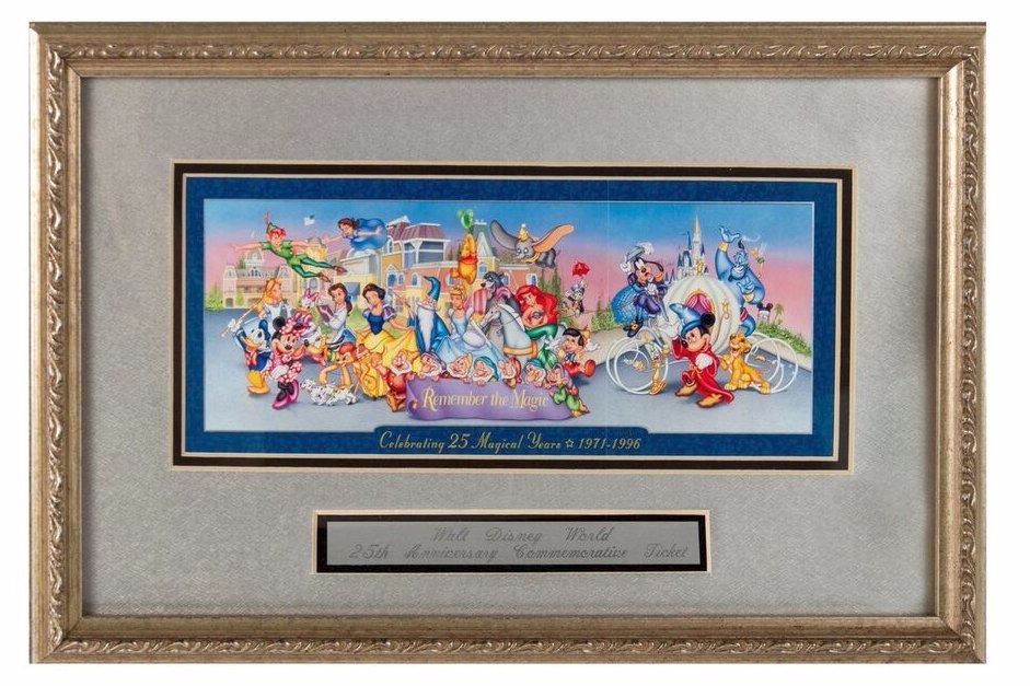 (Walt Disney World, 1996) A special unused commemorative ticket created to celebrate the 25th Anniversary of Walt Disney World. This ticket features numerous Disney characters on Main Street at Walt Disney World, and comes custom framed with a plaque noting the anniversary. The back of the frame has a window so that the back of the ticket is viewable. This back lists the rules for exchanging the ticket for a park voucher, and shows the ticket number. This item measures 9.25"x14" framed, and is in very good condition.
