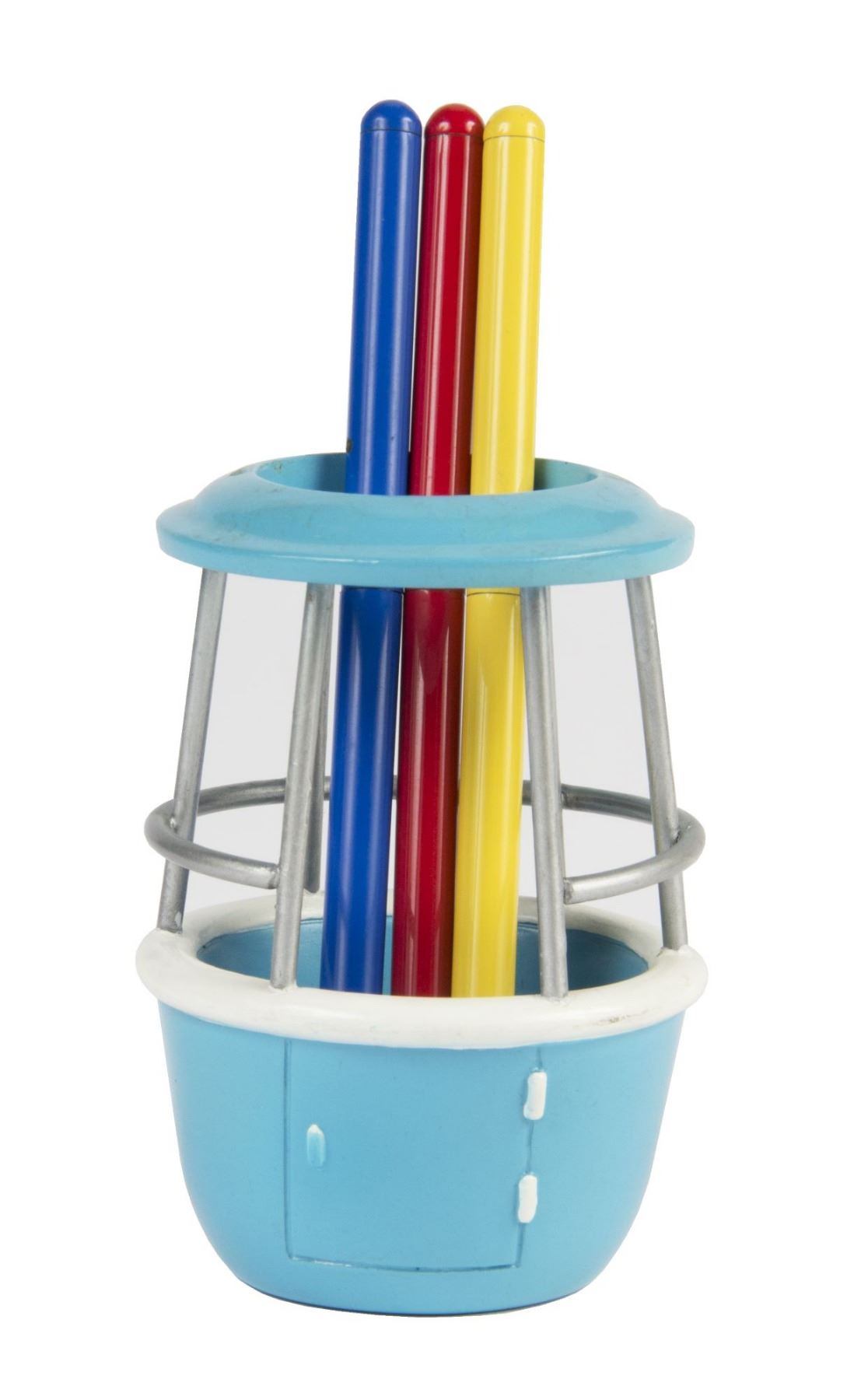 (Disneyland, 2005) A retro-inspired pen holder modeled after Disneyland's first "Skyway" buckets. While later "Skyway" vehicles were rounded and could carry more passengers, the earliest "Skyway" vehicles were in this elongated style. The pen holder includes its original 3 Disney pens which feature some of the colors of the original buckets. Measuring 4" tall, the pen holder is in good condition with minor wear from use.