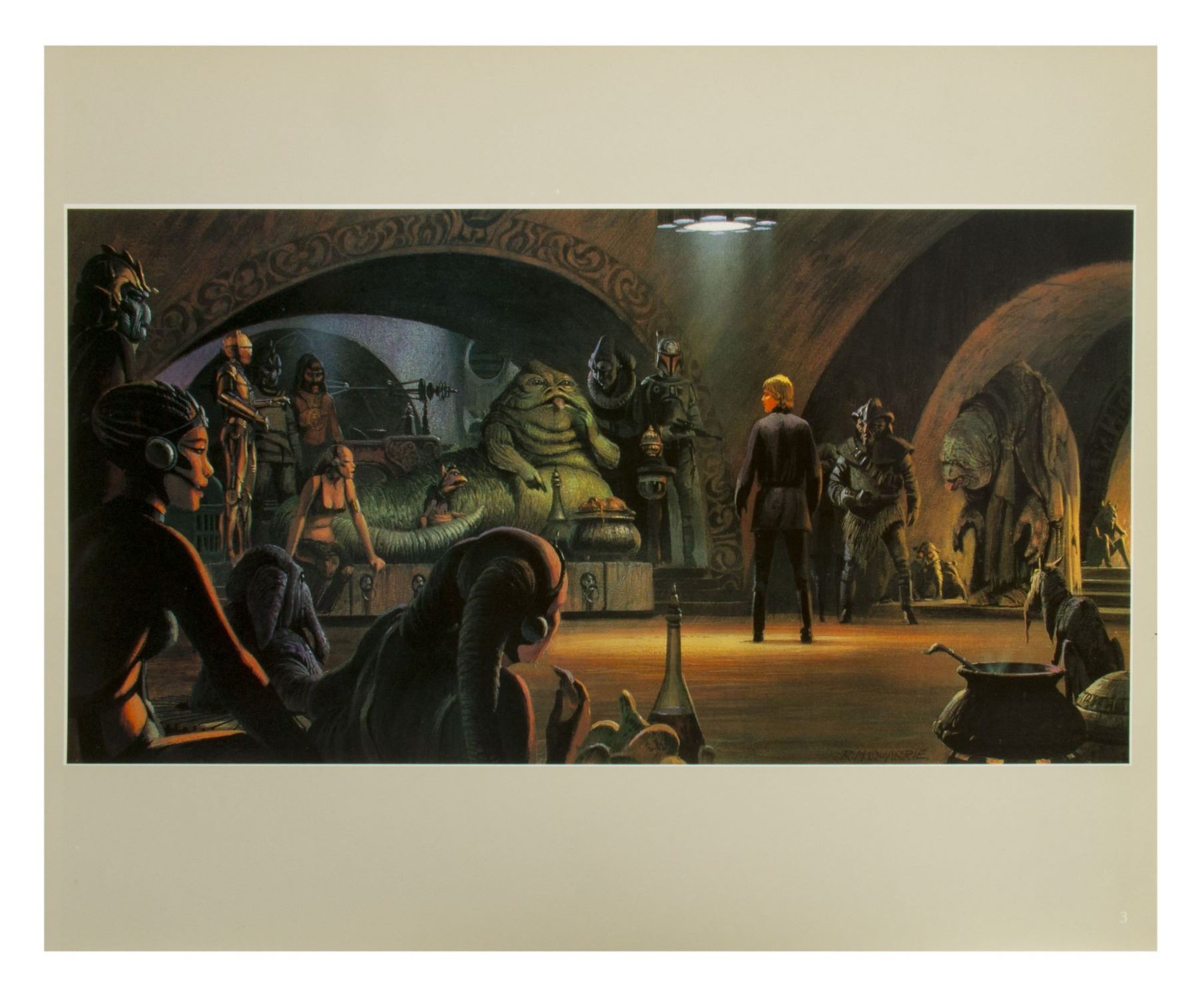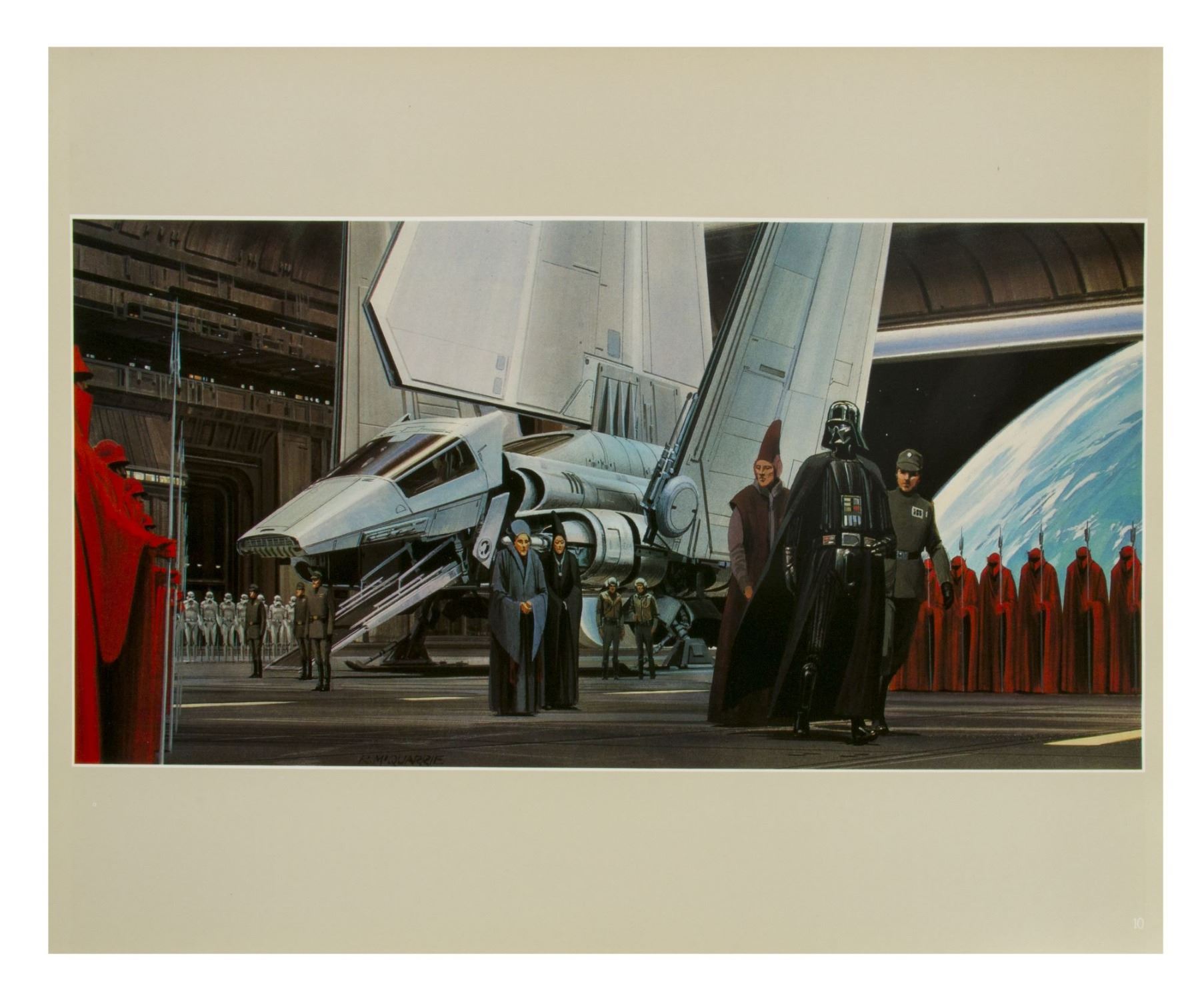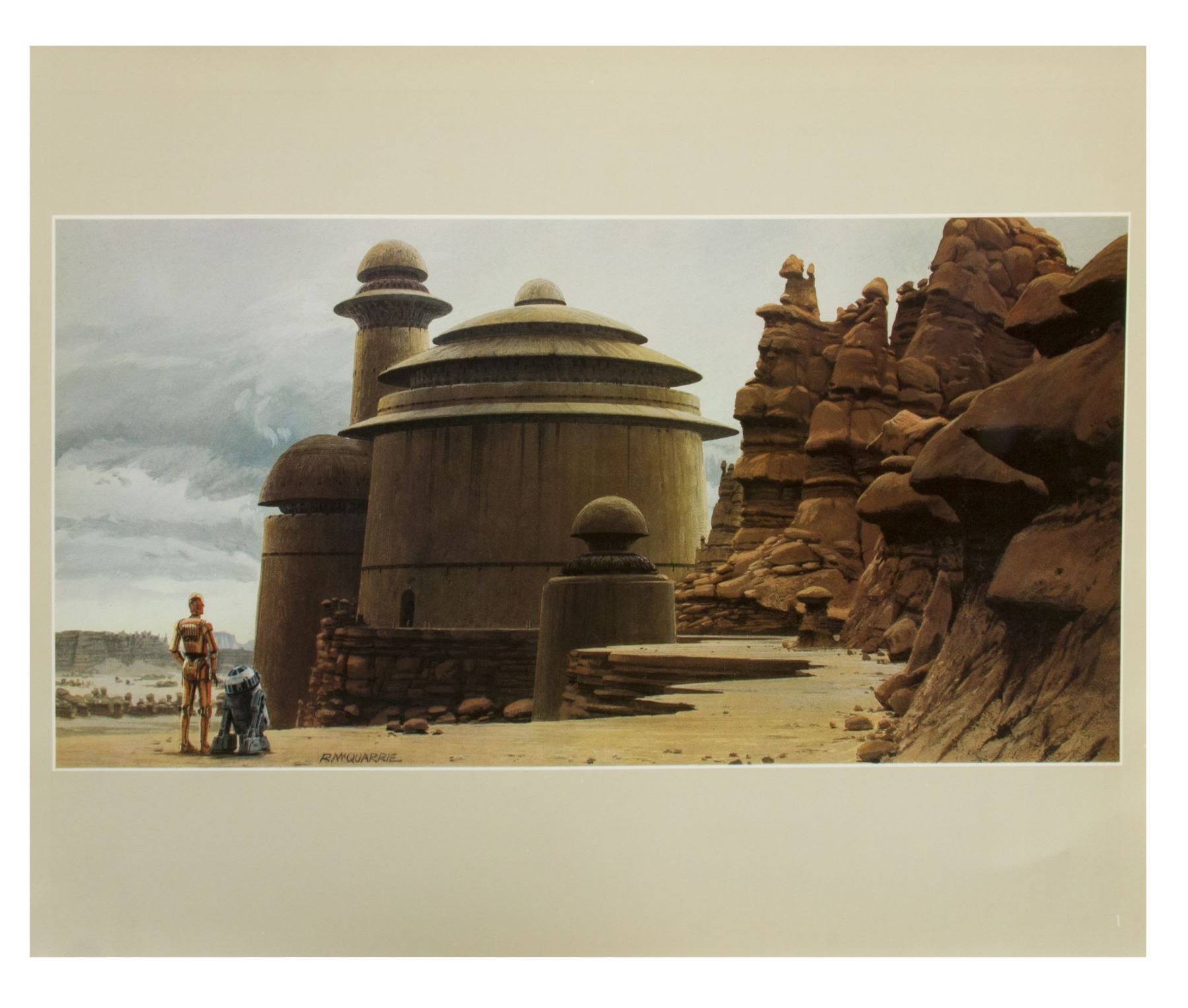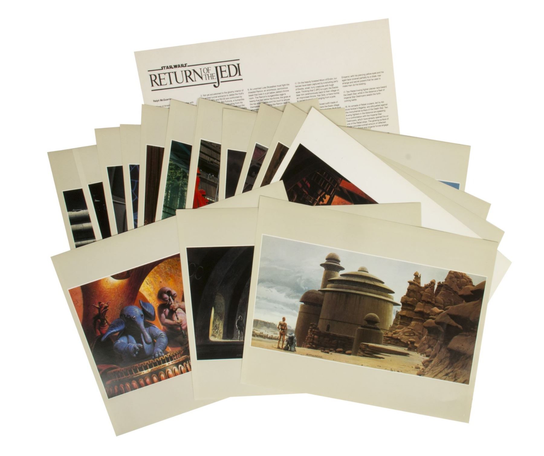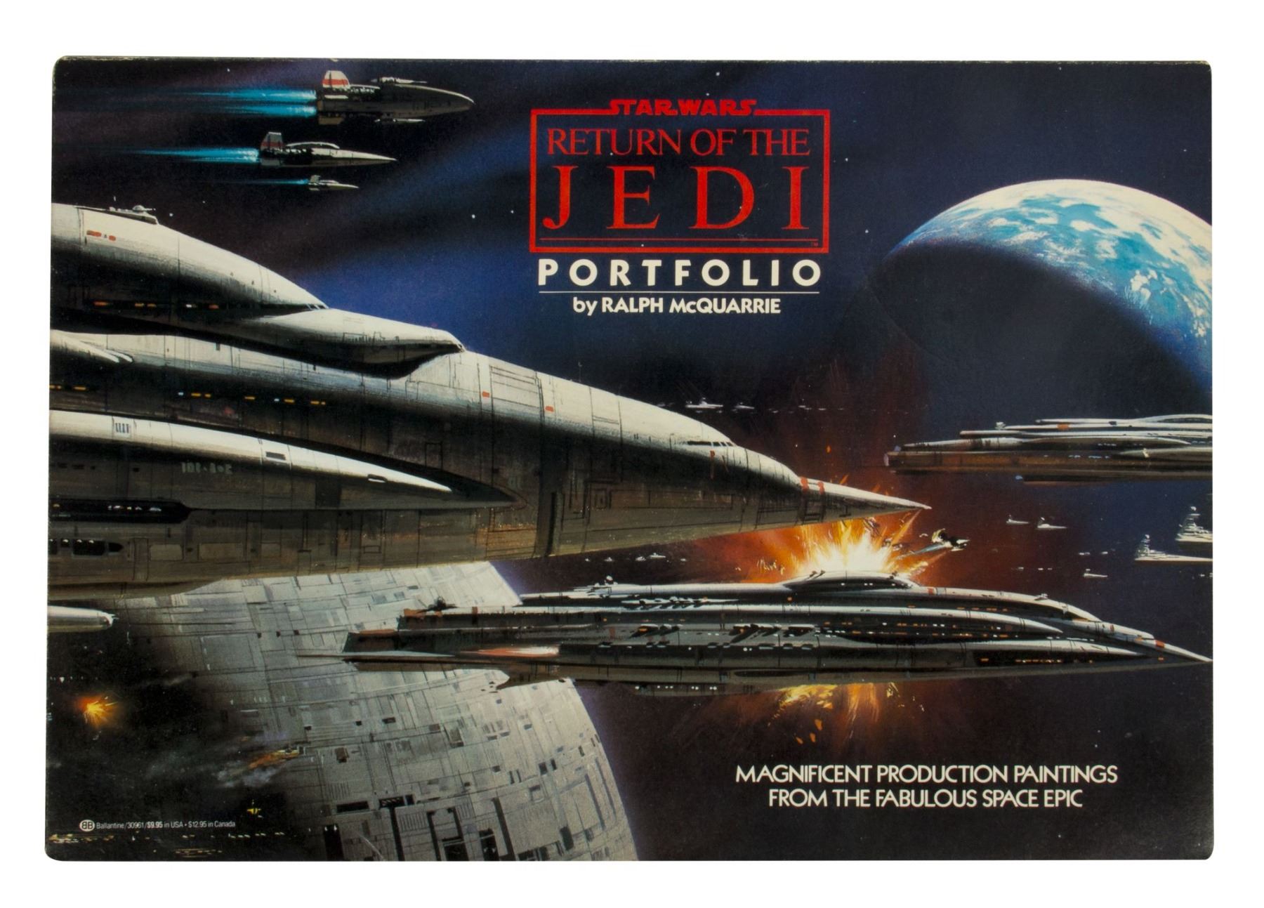 (LucasFilm, c.1983) An incredible portfolio collection of Ralph McQuarrie's iconic concept art that was used in the production of "Return of the Jedi". This portfolio includes all (20) concept art prints as well as the original title sheet that lists this set as a first edition. Each print measures 11"x15.5" and the outer portfolio cover measures 11.25"x15.5". The condition is very good with some edge-wear to the cover, and some interior toning to the cover where it rested against the inner cardboard.