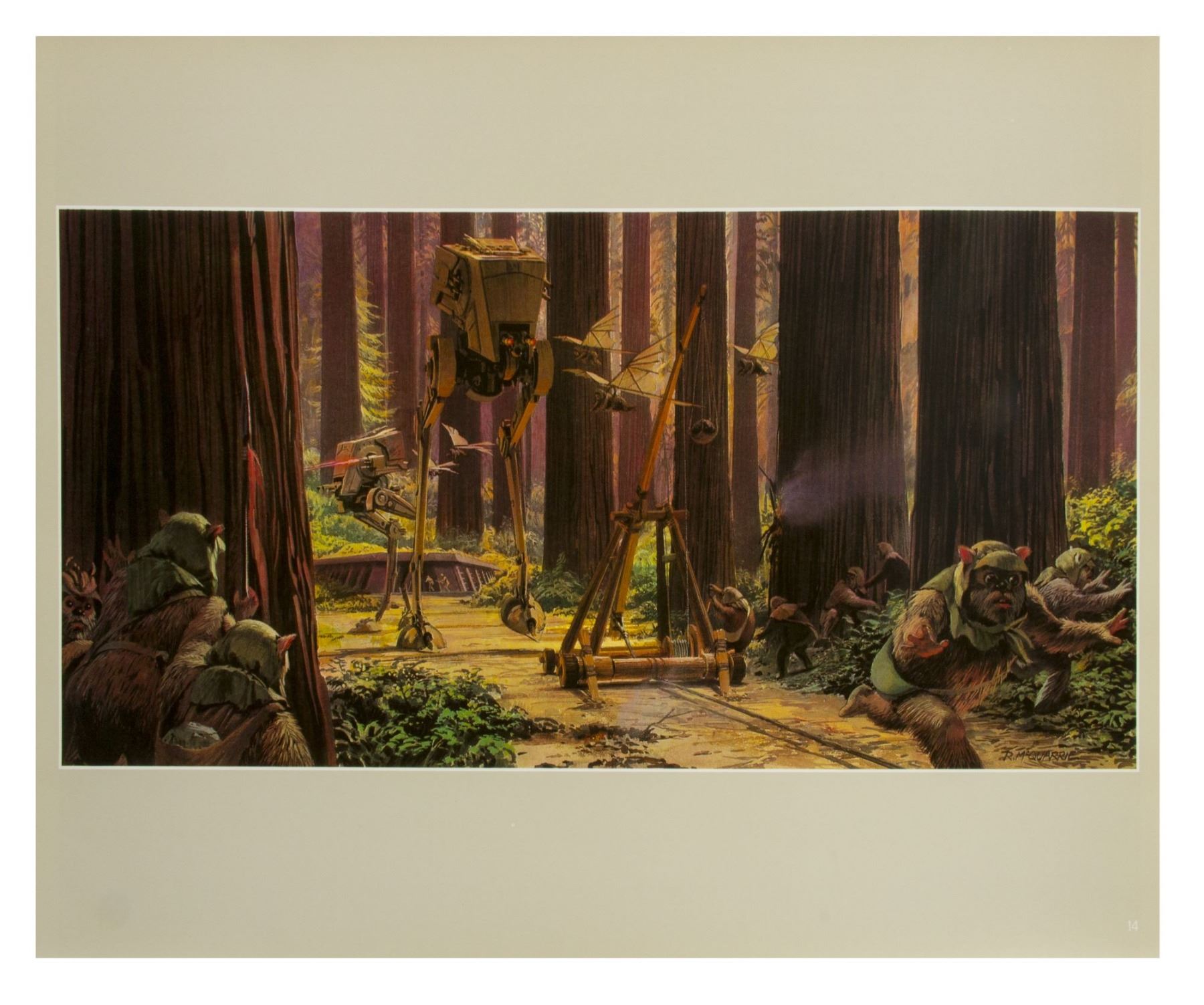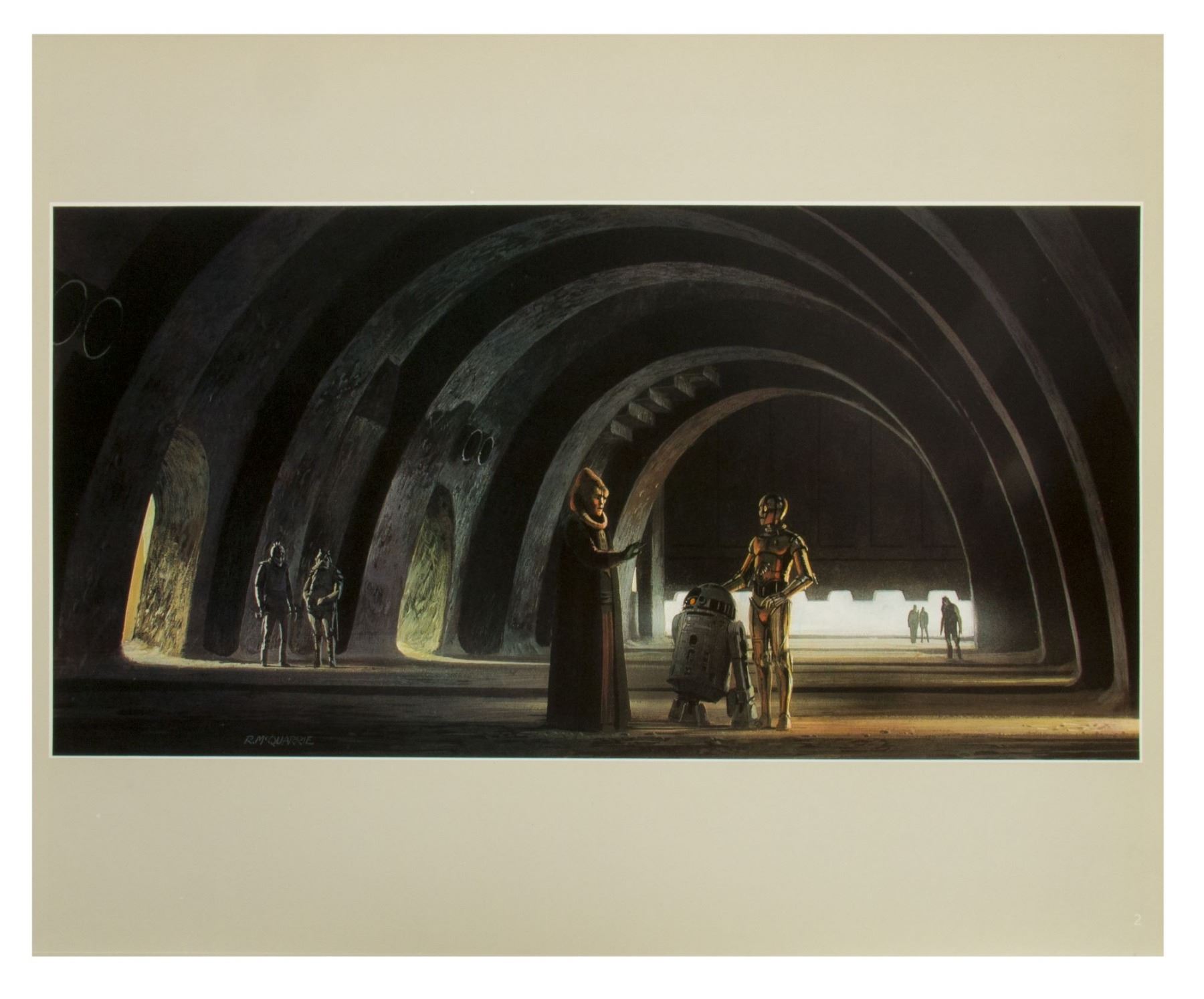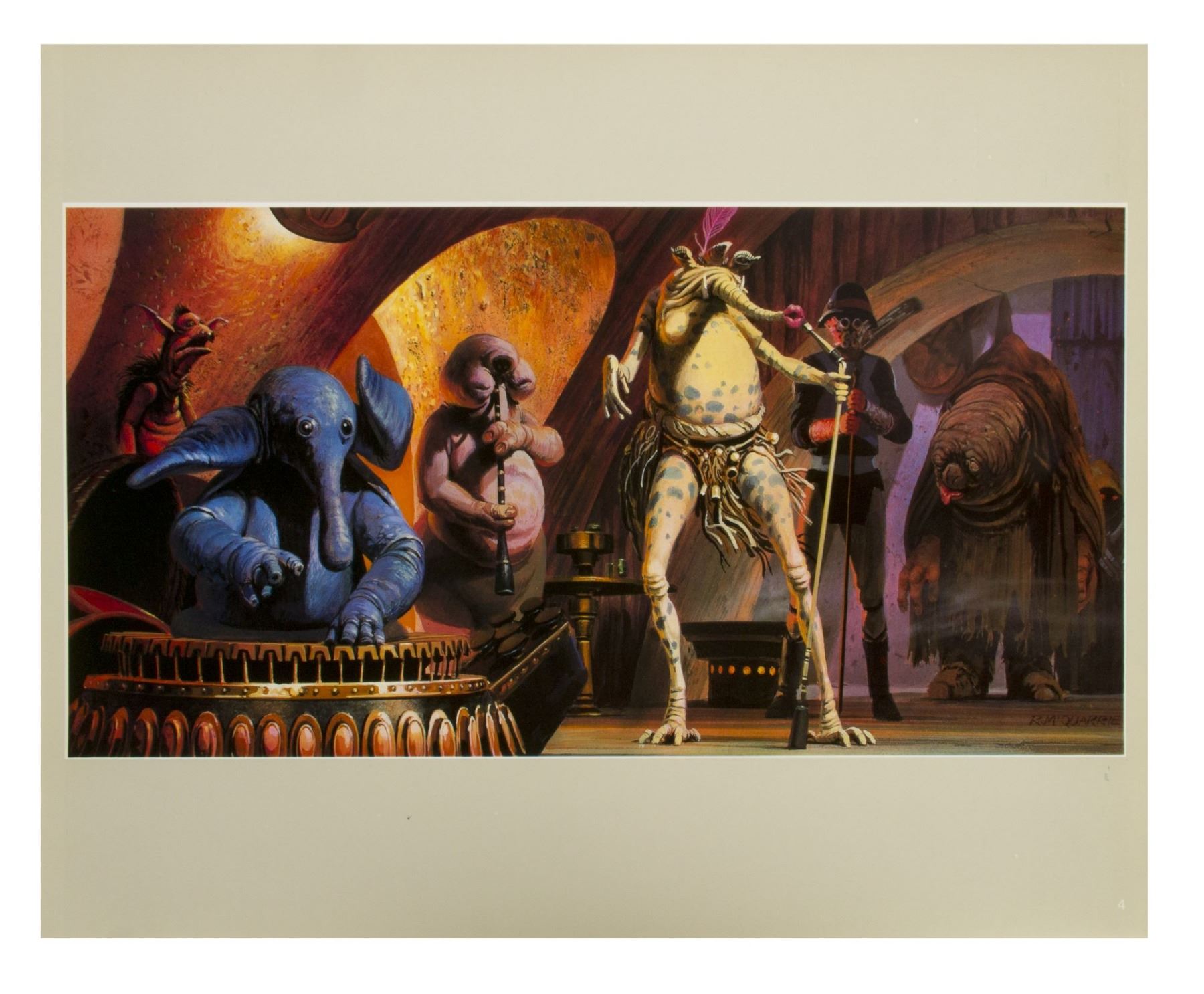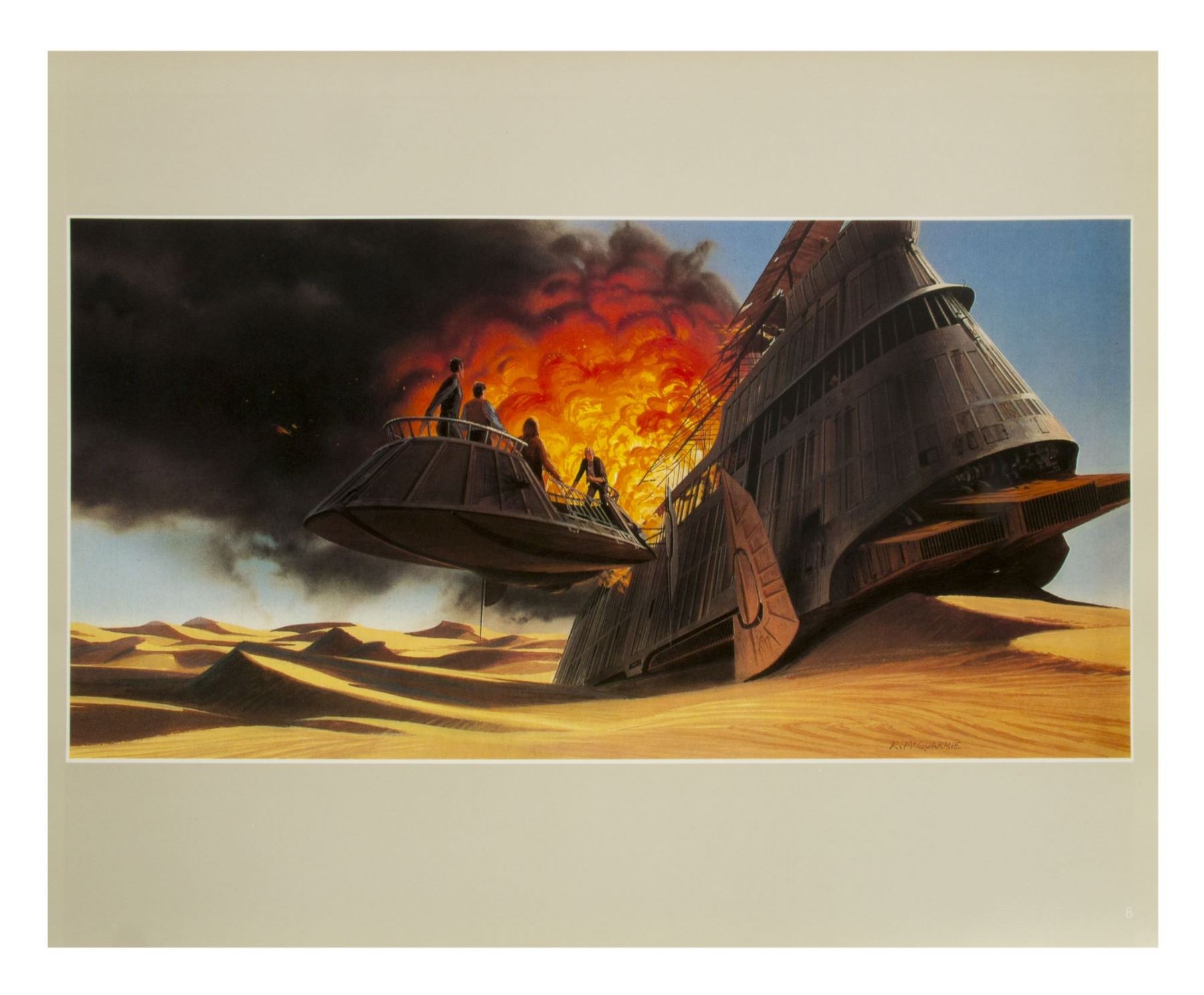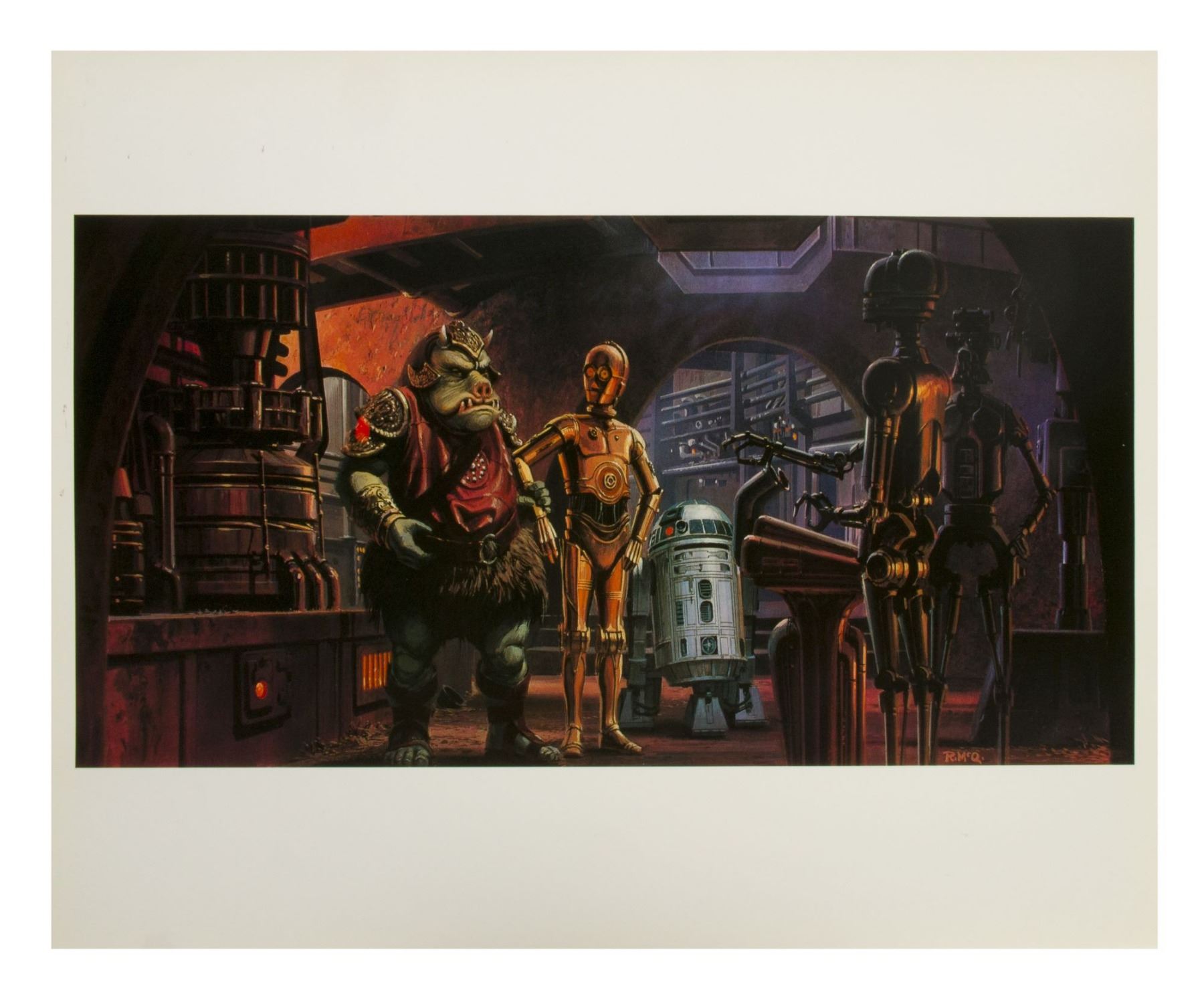 (LucasFilm, c.1983) An incredible portfolio collection of Ralph McQuarrie's iconic concept art that was used in the production of "Return of the Jedi". This portfolio includes all (20) concept art prints as well as the original title sheet that lists this set as a first edition. Each print measures 11"x15.5" and the outer portfolio cover measures 11.25"x15.5". The condition is very good with some edge-wear to the cover, and some interior toning to the cover where it rested against the inner cardboard.