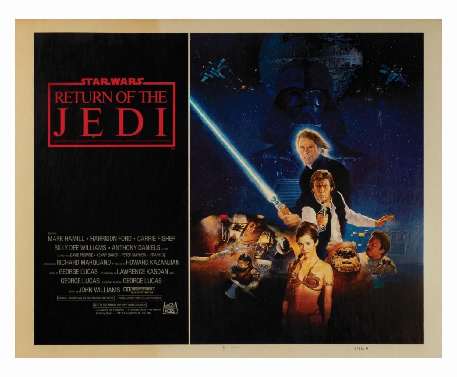 (LucasFilm, 1983) An original Style-B half sheet poster for Return of the Jedi. Featuring the incredible artwork of Kazuhiko Sano, this lithographically printed cardstock poster measures 22"x28". The condition is good overall with minor edge-wear, a few small creases, and some yellowing to the white margins on the left-side of the poster. The poster has been custom framed with archival glass for its continued preservation.