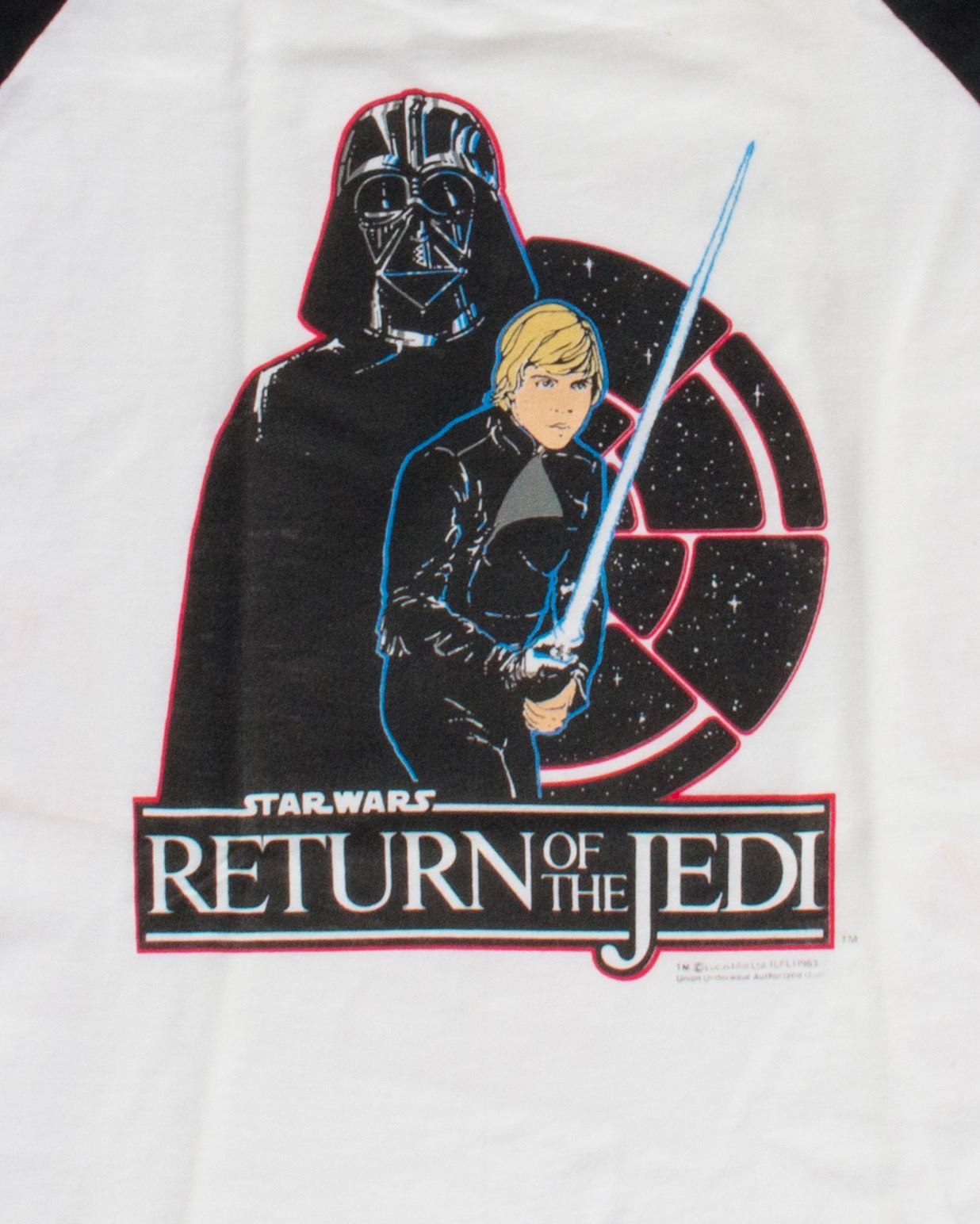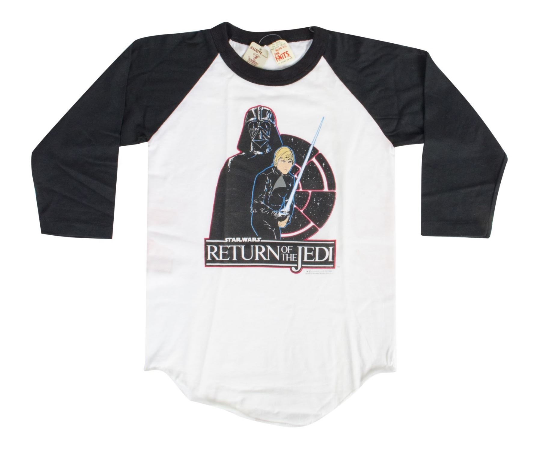 (LucasFilm, 1983) A very rare vintage "Return of the Jedi" shirt that is unworn with its original tags attached. This particular shirt features an iconic illustration of Luke and Darth Vader, and is very difficult to find in any condition. The shirt is marked as a size M(10-12), and the condition is good with some reddish areas of discoloration in the body of the shirt from its long-term storage.