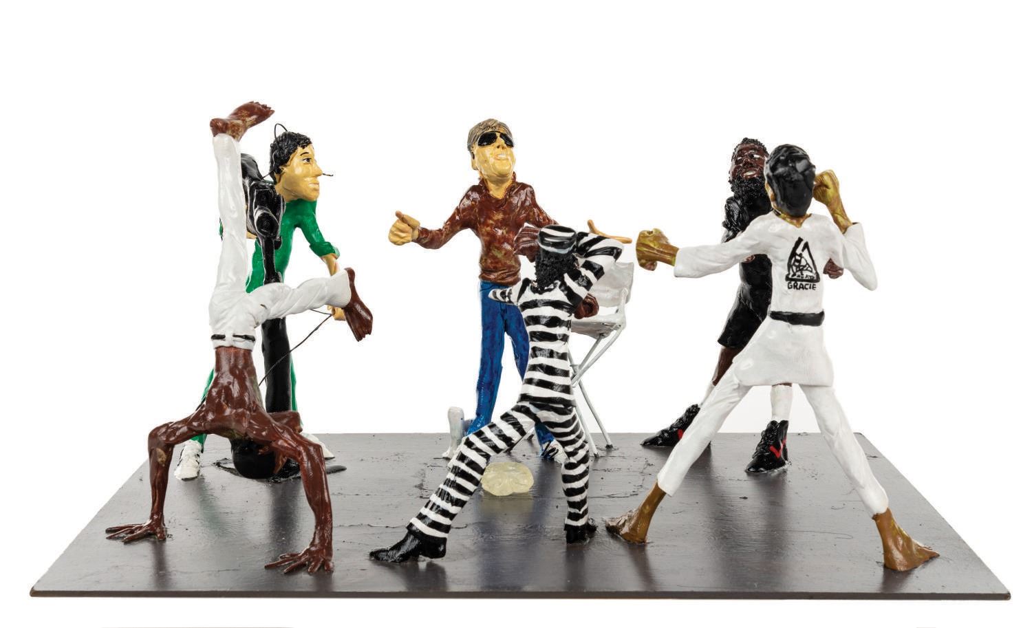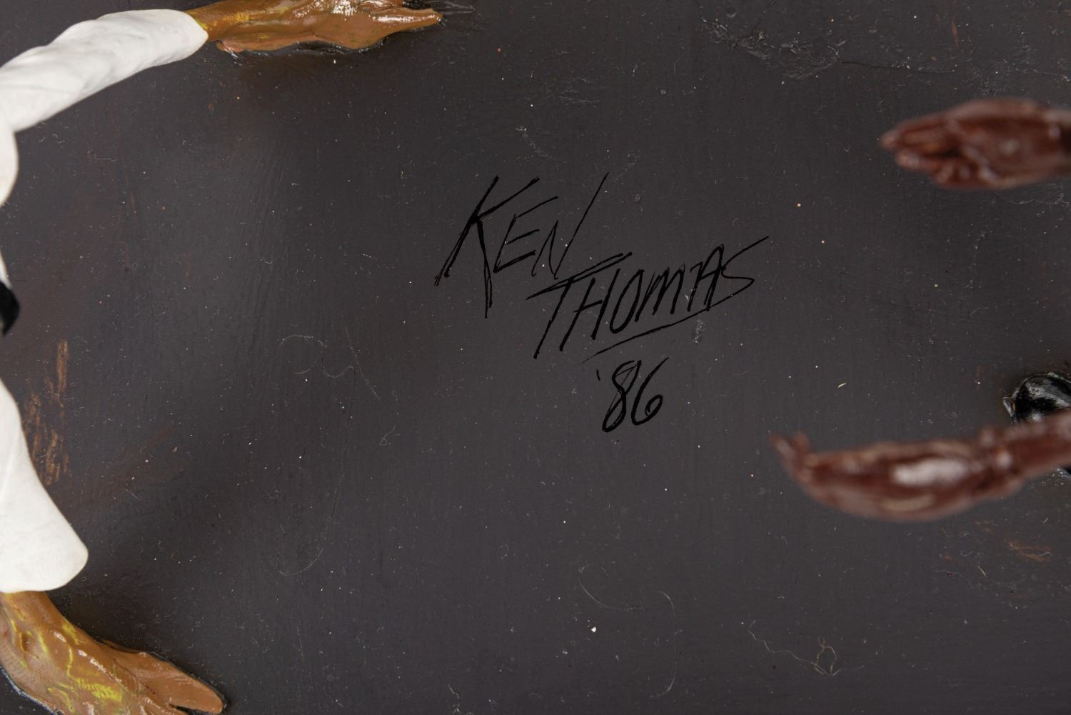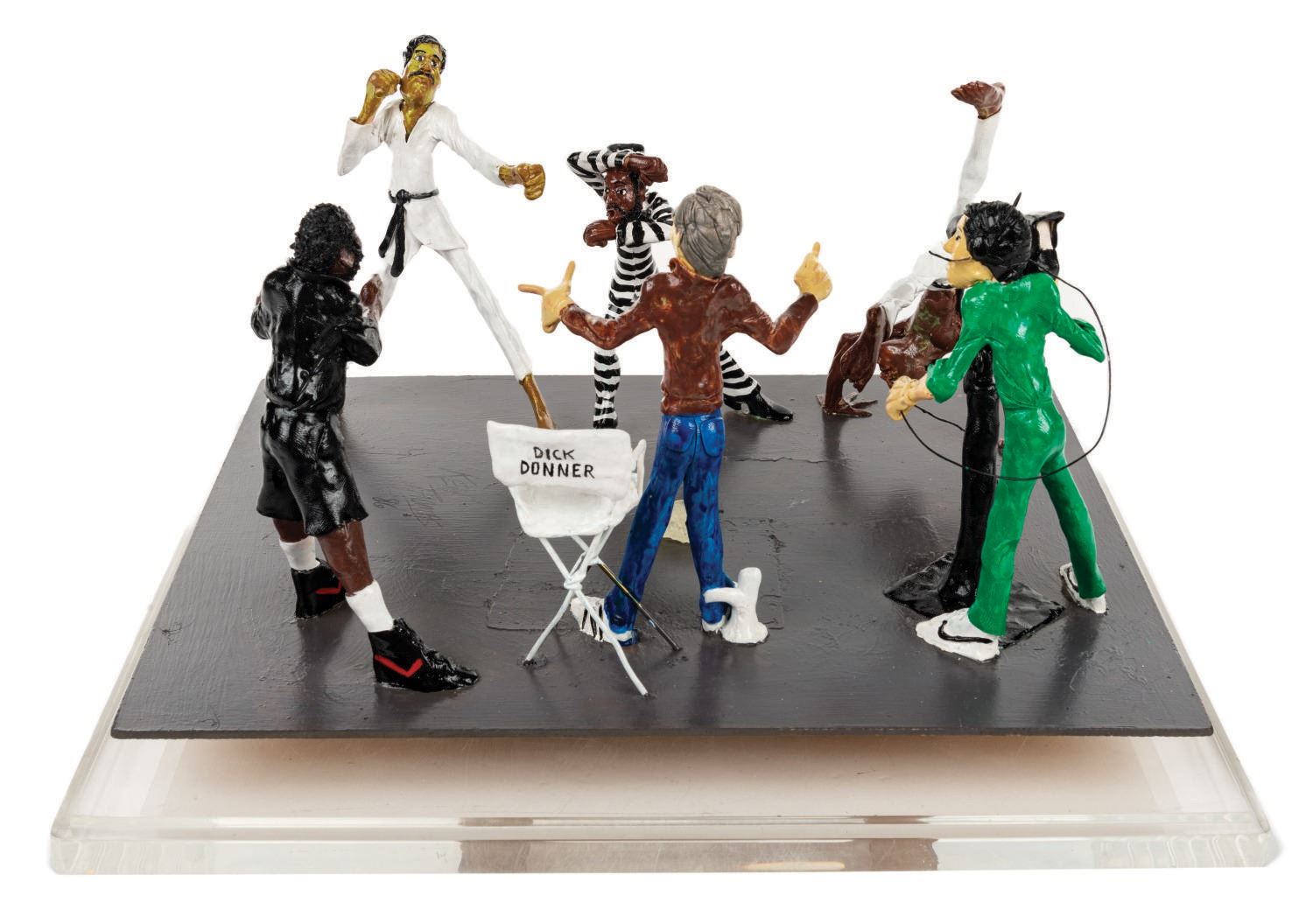 (Warner Bros., 1992) A sculpted art piece inspired by Lethal Weapon 3, gifted to director Richard Donner. The artwork is signed "Ken Thomas, '86," and depicts Richard Donner, cameraman Jan DuBont, Brazilian Jiu Jitsu Grand Master martial arts trainer Rorion Gracie, and three others producing a scene for the film.. Measuring 8" tall and 14"x11", the sculpture was mounted to a block and comes within an acrylic display measuring 9.5" tall and 15.5"x12.5". The entire piece is in fine condition, while the protective display case exhibits some scuffs and scratches.