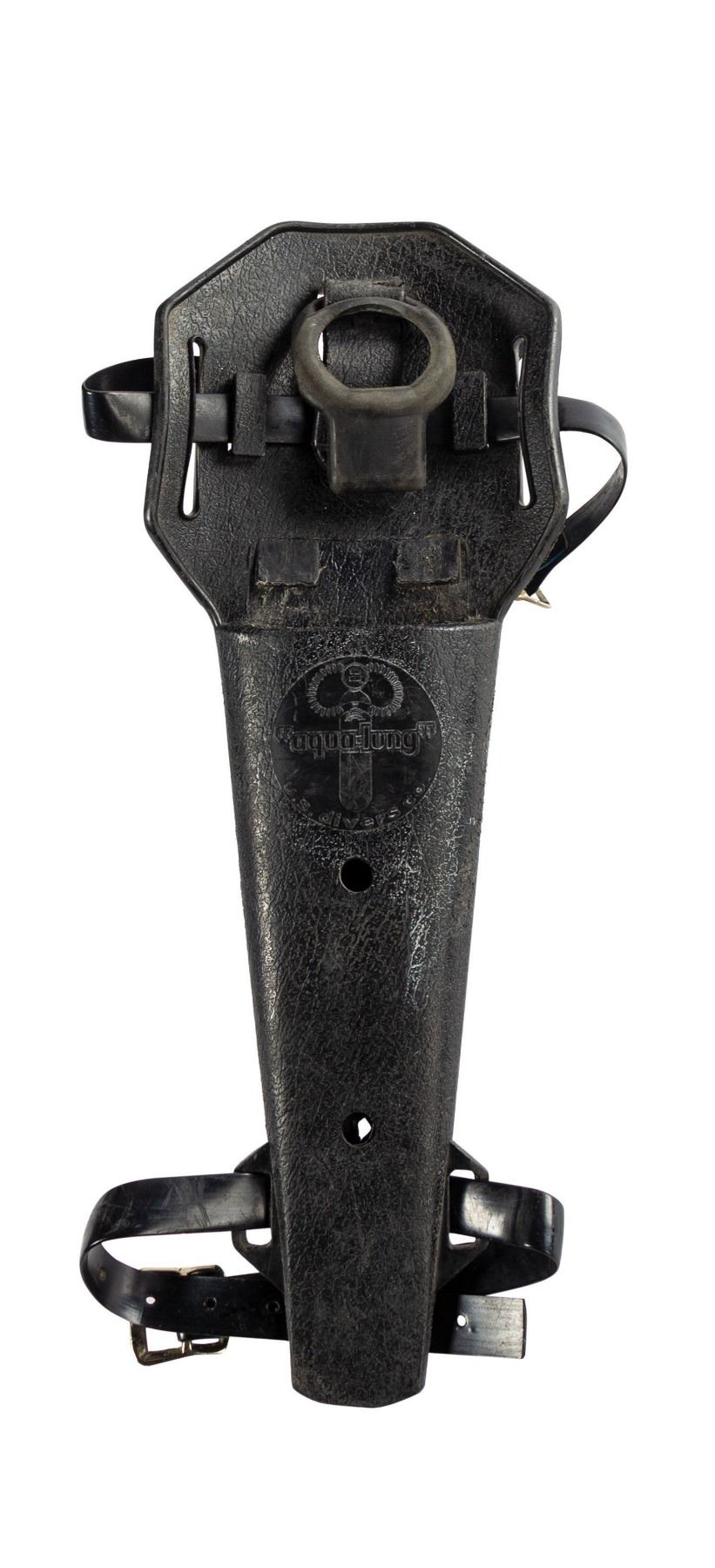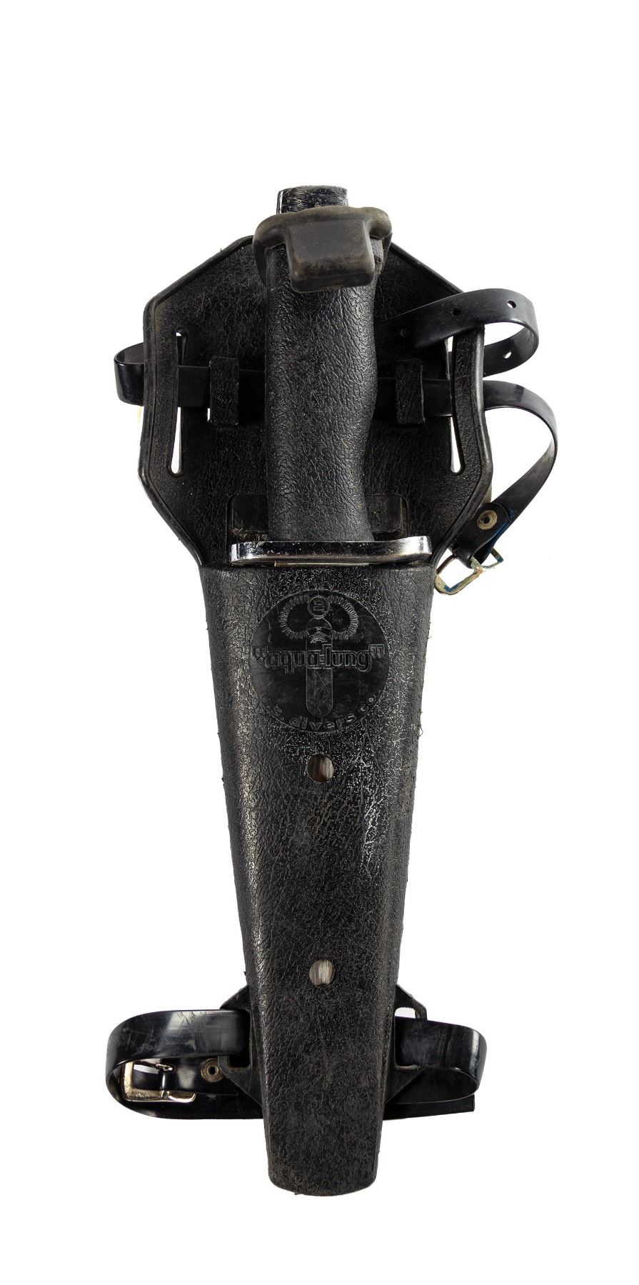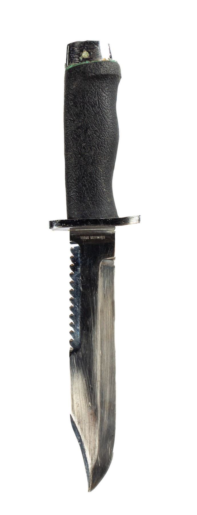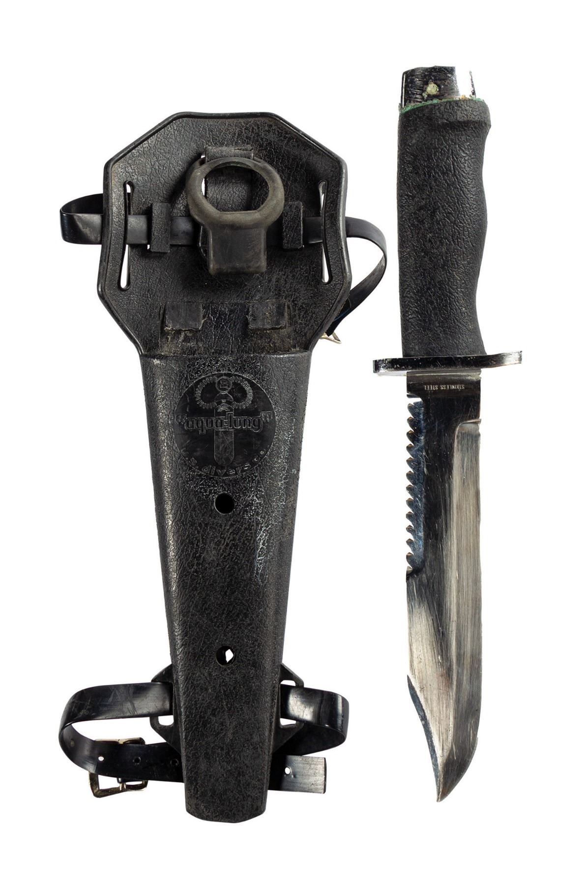 (Universal, 1975) An original stunt knife prop used by Richard Dreyfuss as Hooper in Jaws. This is the knife used to pry the shark tooth out of the sunken boat, and is also used in the famous cage sequence. The knife comes from the esteemed Jaws prop collection of Chris Kiszka. A letter of provenance from Kiszka will be provided to the winning bidder. The sheath measures 13"x5" without the straps, and both knife and sheath are in good condition with expected wear from age and use. There is some surface wear, including minor scratches on the blade and some discoloration to the plastic, as well s a few small spots of cracking. The top strap has a few spots of blue paint around and on the buckle.