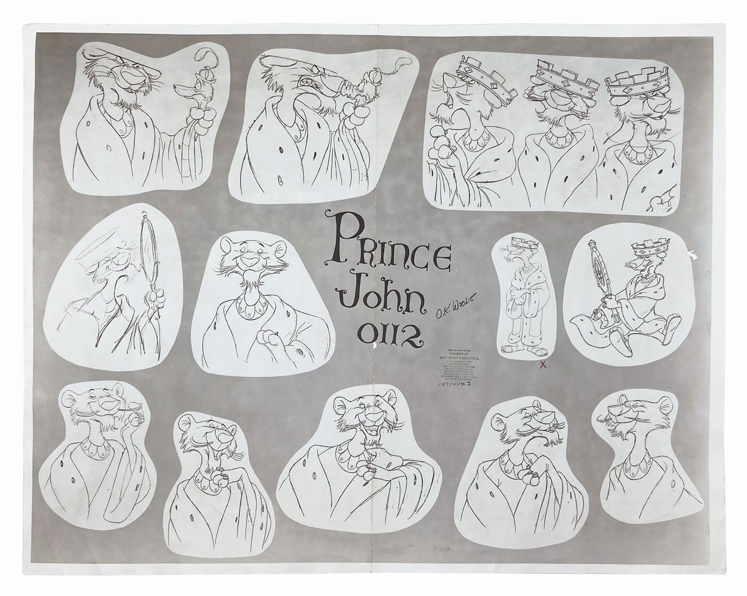 (Disney, 1973) A Walt Disney Studios created photostat model sheet featuring images of Prince John from Robin Hood. Model sheets like this were shared among animators to ensure that the character was drawn the same way. This particular sheet features the printed note of "O.K. Woolie" signifying that Wolfgang "Woolie" Reitherman, one of Disney's Nine Old Men, originally signed off on these designs. The entire piece measures 11"x14" and is in very good condition with some edge wear and a crease through the center from being folded.